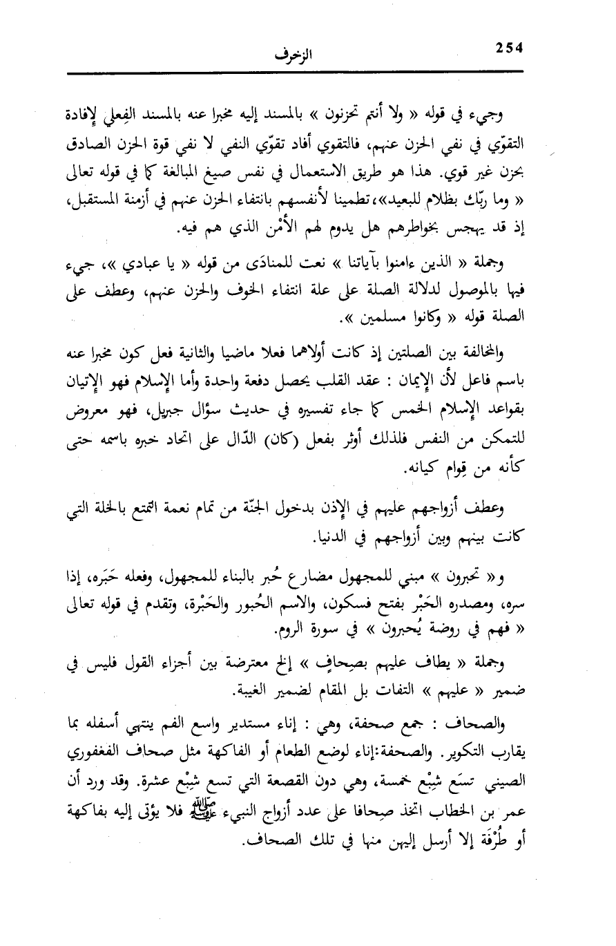 وَجُمْلَةُ الَّذِينَ آمَنُوا بِآياتِنا نَعْتٌ لِلْمُنَادَى مِنْ قَوْله: يَا عِبادِ جِيءَ فِيهَا بِالْمَوْصُولِ لِدَلَالَةِ الصِّلَةِ عَلَى عِلَّةِ انْتِفَاءِ الْخَوْفِ وَالْحُزْنِ عَنْهُمْ، وَعُطِفَ عَلَى الصِّلَةِ قَوْلُهُ: