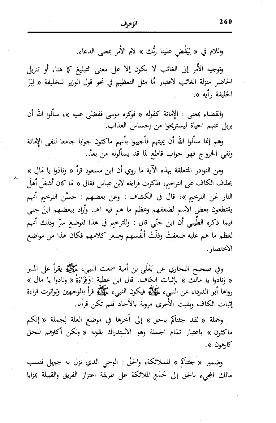 وَلِلتَّرْخِيمِ فِي هَذَا الْمَوْضِعِ سِرٌّ وَذَلِكَ أَنَّهُمْ لِعِظَمِ مَا هُمْ عَلَيْهِ ضَعُفَتْ وَذُلَّتْ أَنْفُسُهُمْ وَصَغُرَ كَلَامُهُمْ فَكَانَ هَذَا مِنْ مَوَاضِعِ الِاخْتِصَارِ. وَفِي «صَحِيحِ الْبُخَارِيِّ» عَنْ يَعْلَى بْنِ أُمَيَّةَ سَمِعت النبيء صَلَّى اللهُ عَلَيْهِ وَسَلَّمَ يَقْرَأُ عَلَى الْمِنْبَرِ وَنادَوْا يَا مالِكُ بِإِثْبَاتِ الْكَافِ. قَالَ ابْنُ عَطِيَّةَ: وَقِرَاءَةُ (وَنَادَوْا يَا مَالِ) رَوَاهَا أَبُو الدَّرْدَاءِ عَن النبيء صَلَّى اللهُ عَلَيْهِ وَسَلَّمَ فَيكون النبيء صَلَّى اللهُ عَلَيْهِ وَسَلَّمَ قَرَأَ بِالْوَجْهَيْنِ وَتَوَاتَرَتْ قِرَاءَةُ إِثْبَاتِ الْكَافِ وَبَقِيَتِ الْأُخْرَى مَرْوِيَّةً بِالْآحَادِ فَلَمْ تَكُنْ قُرْآنًا.