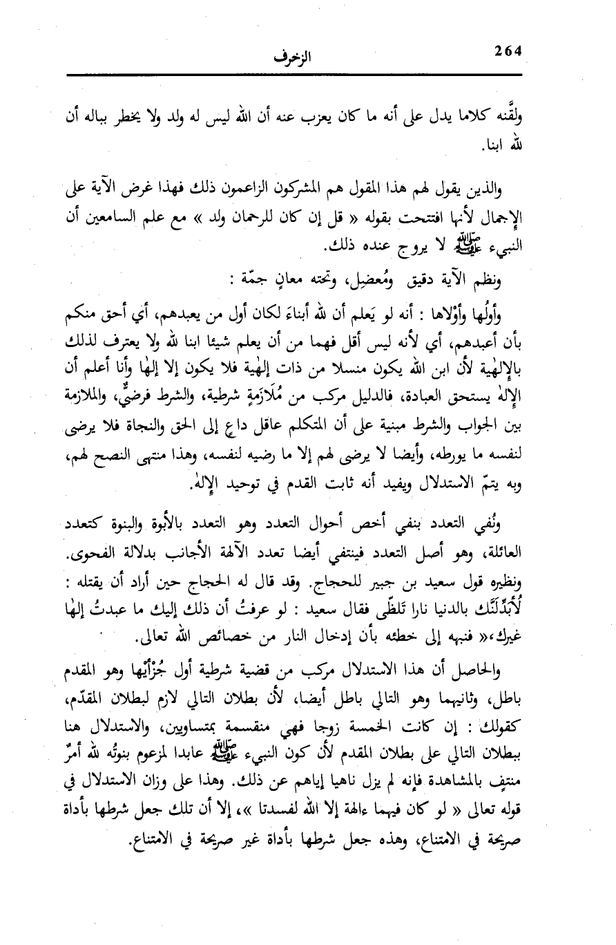 إِنْ كَانَتِ الْخَمْسَةُ زَوْجًا فَهِيَ مُنْقَسِمَةٌ بِمُتَسَاوِيَيْنِ، وَالِاسْتِدْلَالُ هُنَا بِبُطْلَانِ التَّالِي عَلَى بُطْلَانِ الْمُقَدَّمِ لِأَنَّ كَون النبيء صَلَّى اللهُ عَلَيْهِ وَسَلَّمَ عَابِدًا لِمَزْعُومٍ بُنُوَّتُهُ لِلَّهِ أَمْرٌ مُنْتَفٍ بِالْمُشَاهَدَةِ فَإِنَّهُ لَمْ يَزَلْ نَاهِيًا إِيَّاهُمْ عَنْ ذَلِكَ. وَهَذَا عَلَى وِزَانِ الِاسْتِدْلَالِ فِي قَوْلِهِ تَعَالَى: لَوْ كانَ فِيهِما آلِهَةٌ إِلَّا اللَّهُ لَفَسَدَتا [الْأَنْبِيَاء: 22] ، إِلَّا أَنَّ تِلْكَ جُعِلَ شَرْطُهَا بِأَدَاةٍ صَرِيحَةٍ فِي الِامْتِنَاعِ، وَهَذِهِ جُعِلَ شَرْطُهَا بِأَدَاةٍ غَيْرِ صَرِيحَةٍ فِي الِامْتِنَاعِ.