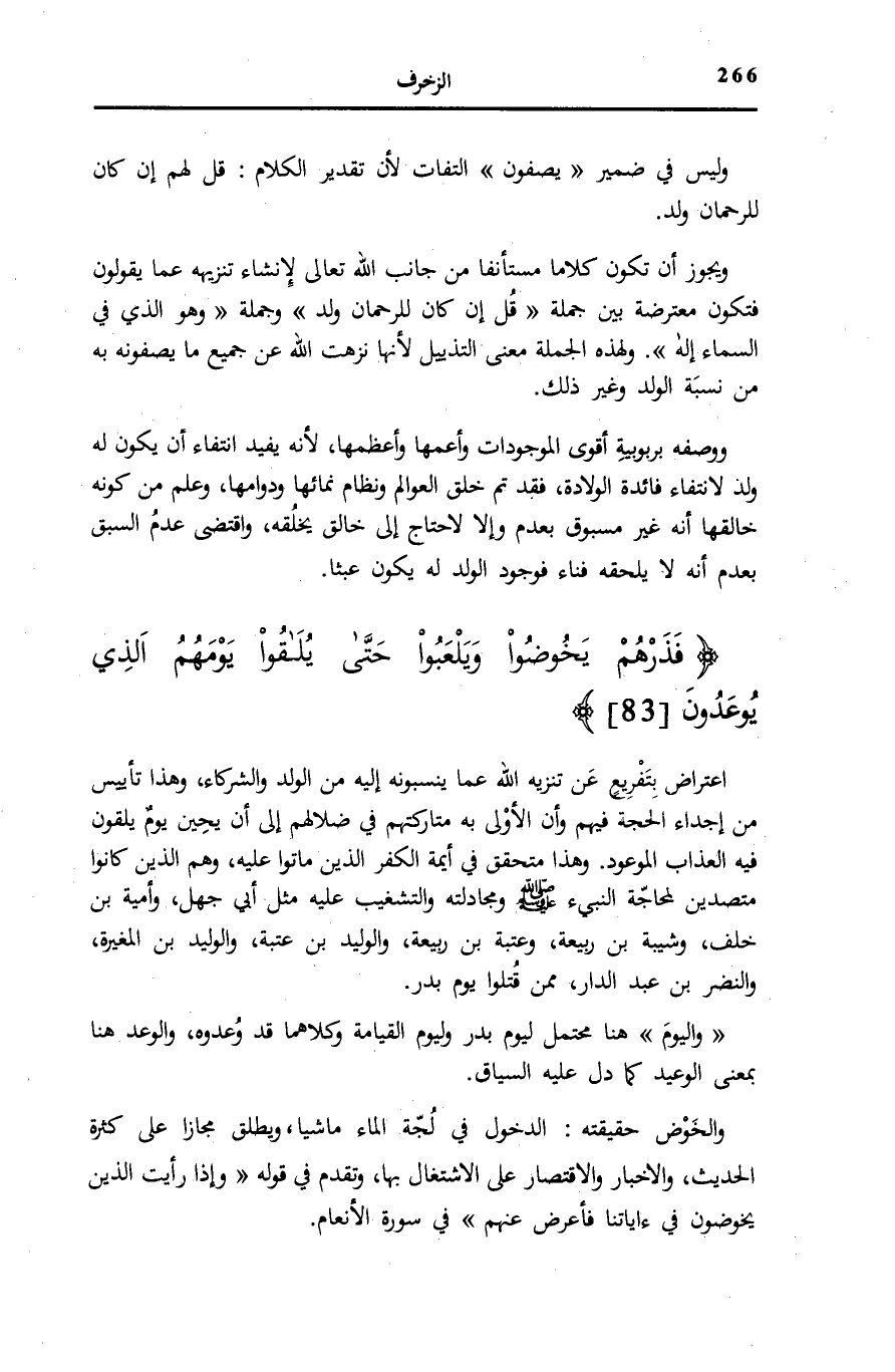 اعْتِرَاضٌ بِتَفْرِيعٍ عَنْ تَنْزِيهِ اللَّهِ عَمَّا يَنْسُبُونَهُ إِلَيْهِ مِنَ الْوَلَدِ وَالشُّرَكَاءِ، وَهَذَا تَأْيِيسٌ مِنْ إِجْدَاءِ الْحُجَّةِ فِيهِمْ وَأَنَّ الْأَوْلَى بِهِ مُتَارَكَتُهُمْ فِي ضَلَالِهِمْ إِلَى أَنْ يَحِينَ يَوْمٌ يَلْقَوْنَ فِيهِ الْعَذَابَ الْمَوْعُودَ. وَهَذَا مُتَحَقق فِي أيمة الْكُفْرِ الَّذِينَ مَاتُوا عَلَيْهِ، وَهُمُ الَّذِينَ كَانُوا مُتَصَدِّينَ لمحاجّة النبيء صَلَّى اللهُ عَلَيْهِ وَسَلَّمَ وَمُجَادَلَتِهِ وَالتَّشْغِيبِ عَلَيْهِ مِثْلَ أَبِي جَهْلٍ وَأُمَيَّةَ بْنِ خَلَفٍ وَشَيْبَةَ بْنِ رَبِيعَةَ وَعُتْبَةَ بْنِ رَبِيعَةَ وَالْوَلِيدِ بْنِ عُتْبَةَ وَالْوَلِيدِ بْنِ الْمُغِيرَةِ وَالنَّضِرِ بْنِ عَبْدِ الدَّارِ مِمَّنْ قُتِلُوا يَوْم بدر.