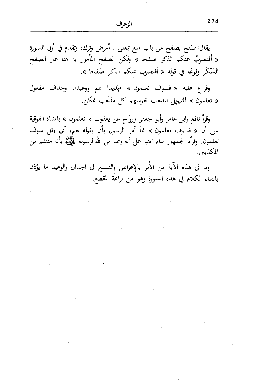يُقَالُ: صَفَحَ يَصْفَحُ مِنْ بَابِ مَنَعَ بِمَعْنَى: أَعْرَضَ وَتَرَكَ، وَتَقَدَّمَ فِي أَوَّلِ السُّورَةِ أَفَنَضْرِبُ عَنْكُمُ الذِّكْرَ صَفْحاً [الزخرف: 5] وَلَكِنَّ الصَّفْحَ الْمَأْمُورَ بِهِ هُنَا غَيْرُ الصَّفْحِ الْمُنْكَرِ وُقُوعُهُ فِي قَوْلِهِ: أَفَنَضْرِبُ عَنْكُمُ الذِّكْرَ صَفْحاً. وَفُرِّعَ عَلَيْهِ فَسَوْفَ تَعْلَمُونَ تَهْدِيدًا لَهُمْ وَوَعِيدًا. وَحُذِفَ مَفْعُولُ تَعْلَمُونَ لِلتَّهْوِيلِ لِتَذْهَبَ نُفُوسُهُمْ كُلَّ مَذْهَبٍ مُمْكِنٍ. وَقَرَأَ نَافِعٌ وَابْنُ عَامِرٍ وَأَبُو جَعْفَرٍ وَرَوْحٌ عَنْ يَعْقُوبَ تَعْلَمُونَ بِالْمُثَنَّاةِ الْفَوْقِيَّةِ عَلَى أَنَّ فَسَوْفَ
