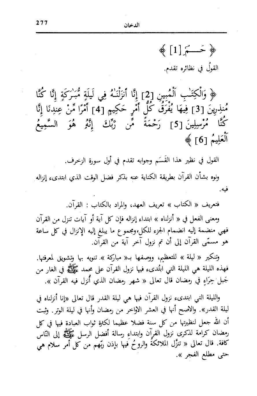 وَالْكِتابِ الْمُبِينِ (2) إِنَّا أَنْزَلْناهُ فِي لَيْلَةٍ مُبارَكَةٍ إِنَّا كُنَّا مُنْذِرِينَ (3) فِيها يُفْرَقُ كُلُّ أَمْرٍ حَكِيمٍ (4) أَمْراً مِنْ عِنْدِنا إِنَّا كُنَّا مُرْسِلِينَ (5) رَحْمَةً مِنْ رَبِّكَ إِنَّهُ هُوَ السَّمِيعُ الْعَلِيمُ (6)