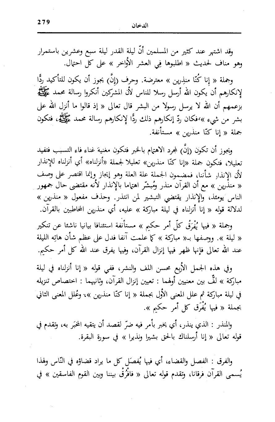وَوَصْفُهَا بِ مُبارَكَةٍ كَمَا عَلِمْتَ آنِفًا فَدَلَّ عَلَى عِظَمِ شَأْنِ هَاتِهِ اللَّيْلَةِ عِنْدَ اللَّهِ تَعَالَى فَإِنَّهَا ظَهَرَ فِيهَا إِنْزَالُ الْقُرْآنِ، وَفِيهَا يُفَرَقُ عِنْدَ اللَّهِ كُلُّ أَمْرٍ حَكِيمٍ. وَفِي هَذِهِ الْجُمَلِ الْأَرْبَعِ مُحَسِّنُ اللَّفِّ وَالنَّشْرِ، فَفِي قَوْلِهِ: إِنَّا أَنْزَلْناهُ فِي لَيْلَةٍ مُبارَكَةٍ لَفٌّ بَيْنَ مَعْنَيَيْنِ أَوَّلُهُمَا: تَعْيِينُ إِنْزَالِ الْقُرْآنِ، وَثَانِيهِمَا: اخْتِصَاصُ تَنْزِيلِهِ فِي لَيْلَةٍ مُبَارَكَةٍ ثُمَّ عَلَّلَ الْمَعْنَى الْأَوَّلَ بِجُمْلَةِ إِنَّا كُنَّا مُنْذِرِينَ، وَعَلَّلَ الْمَعْنَى الثَّانِي بِجُمْلَةِ فِيها يُفْرَقُ كُلُّ أَمْرٍ حَكِيمٍ.