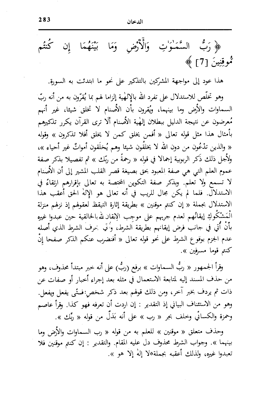 أَفَمَنْ يَخْلُقُ كَمَنْ لَا يَخْلُقُ أَفَلا تَذَكَّرُونَ [النَّحْل: 17] وَقَوْلِهِ: وَالَّذِينَ تَدْعُونَ مِنْ دُونِ اللَّهِ لَا يَخْلُقُونَ شَيْئاً وَهُمْ يُخْلَقُونَ أَمْواتٌ غَيْرُ أَحْياءٍ [النَّحْل: 20، 21] ، وَلِأَجْلِ ذَلِكَ ذَكَرَ الرُّبُوبِيَّةَ إِجْمَالًا فِي قَوْلِهِ: رَحْمَةً مِنْ رَبِّكَ [الدُّخان: 6] ثُمَّ تَفْصِيلًا بِذِكْرِ صِفَةِ عُمُومِ الْعِلْمِ الَّتِي هِيَ صِفَةُ الْمَعْبُودِ بِحَقٍّ بِصِيغَةِ قَصْرِ الْقَلْبِ الْمُشِيرِ إِلَى أَنَّ الْأَصْنَامَ لَا تَسْمَعُ وَلَا تَعْلَمُ. وَبِذِكْرِ صِفَةِ التَّكْوِينِ الْمُخْتَصَّةِ بِهِ تَعَالَى بِإِقْرَارِهِمُ ارْتِقَاءً فِي الِاسْتِدْلَالِ. فَلَمَّا لَمْ يَكُنْ مَجَالٌ لِلرَّيْبِ فِي أَنَّهُ تَعَالَى هُوَ الْإِلَهُ الْحَقُّ أَعْقَبَ هَذَا الِاسْتِدْلَالَ بِجُمْلَةِ إِنْ كُنْتُمْ مُوقِنِينَ بِطَرِيقَةِ إِثَارَةِ التَّيَقُّظِ لِعُقُولِهِمْ إِذْ نَزَّلَهُمْ مَنْزِلَةَ الْمَشْكُوكِ إِيقَانُهُمْ لِعَدَمِ جَرْيِهِمْ عَلَى مُوجَبِ الْإِيقَانِ لِلَّهِ بِالْخَالِقِيِّةِ حِينَ عَبَدُوا غَيْرَهُ بِأَنْ أُتِيَ فِي جَانِبِ فَرْضِ إِيقَانِهِمْ بِطَرِيقَةِ الشَّرْطِ، وَأُتِيَ بِحَرْفِ الشَّرْطِ الَّذِي أَصْلُهُ عَدَمُ الْجَزْمِ بِوُقُوعِ الشَّرْطِ عَلَى نَحْوِ قَوْلِهِ تَعَالَى: أَفَنَضْرِبُ عَنْكُمُ الذِّكْرَ صَفْحاً أَنْ كُنْتُمْ قَوْماً مُسْرِفِينَ [الزخرف: 5] .