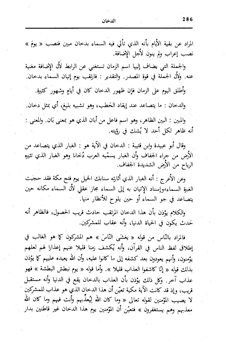فَالْمُرَادُ بِالنَّاسِ مِنْ قَوْلِهِ: يَغْشَى النَّاسَ هُمُ الْمُشْرِكُونَ كَمَا هُوَ الْغَالِبُ فِي إِطْلَاقِ لَفْظِ النَّاسِ فِي الْقُرْآنِ، وَأَنَّهُ يَكْشِفُ زَمَنًا قَلِيلًا عَنْهُمْ إِعْذَارًا لَهُمْ لَعَلَّهُمْ يُؤْمِنُونَ، وَأَنَّهُمْ يَعُودُونَ بَعْدَ كَشْفِهِ إِلَى مَا كَانُوا عَلَيْهِ، وَأَنَّ اللَّهَ يُعِيدُهُ عَلَيْهِمْ كَمَا يُؤْذِنُ بِذَلِكَ قَوْلُهُ: إِنَّا كاشِفُوا الْعَذابِ قَلِيلًا [الدُّخان: 15] . وَأَمَّا قَوْلُهُ: يَوْمَ نَبْطِشُ الْبَطْشَةَ [الدُّخان: 16] فَهُوَ عَذَابٌ آخَرُ. وَكُلُّ ذَلِكَ يُؤْذِنُ بِأَنَّ الْعَذَابَ بِالدُّخَانِ يَقَعُ فِي الدُّنْيَا وَأَنَّهُ مُسْتَقْبَلٌ قَرِيبٌ، وَإِذْ قَدْ كَانَتِ الْآيَةُ مَكِّيَّةً تَعَيَّنَ أَنَّ هَذَا الدُّخَانَ الَّذِي هُوَ عَذَابٌ لِلْمُشْرِكِينَ لَا يُصِيبُ الْمُؤْمِنِينَ لِقَوْلِهِ تَعَالَى: وَما كانَ اللَّهُ لِيُعَذِّبَهُمْ وَأَنْتَ فِيهِمْ وَما كانَ اللَّهُ مُعَذِّبَهُمْ وَهُمْ يَسْتَغْفِرُونَ [الْأَنْفَال: 33] فَتَعَيَّنَ أَنَّ الْمُؤْمِنِينَ يَوْمَ هَذَا الدُّخَانِ غَيْرُ قَاطِنِينَ بِدَارِ