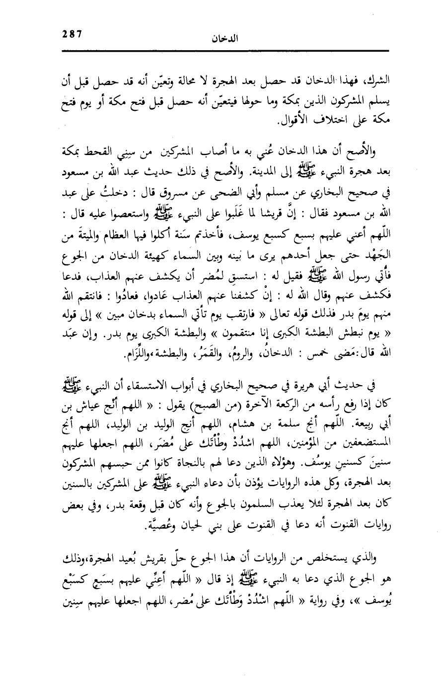 الشِّرْكِ، فَهَذَا الدُّخَانُ قَدْ حَصَلَ بَعْدَ الْهِجْرَةِ لَا مَحَالَةَ وَتَعَيَّنَ أَنَّهُ قَدْ حَصَلَ قَبْلَ أَنْ يُسْلِمَ الْمُشْرِكُونَ الَّذِينَ بِمَكَّةَ وَمَا حَوْلَهَا فَيَتَعَيَّنُ أَنَّهُ حَصَلَ قَبْلَ فَتْحِ مَكَّةَ أَوْ يَوْمَ فَتْحِ مَكَّةَ عَلَى اخْتِلَافِ الْأَقْوَالِ. وَالْأَصَحُّ أَنَّ هَذَا الدُّخَانَ عُنِيَ بِهِ مَا أَصَابَ الْمُشْرِكِينَ مِنْ سِنِي الْقَحْطِ بِمَكَّةَ بَعْدَ هِجْرَة النبيء صَلَّى اللهُ عَلَيْهِ وَسَلَّمَ إِلَى الْمَدِينَةِ. وَالْأَصَحُّ فِي ذَلِكَ حَدِيثُ عَبْدِ اللَّهِ بْنِ مَسْعُودٍ فِي «صَحِيحِ الْبُخَارِيِّ» عَنْ مُسْلِمٍ وَأَبِي الضُّحَى عَنْ مَسْرُوقٍ قَالَ: دَخَلْتُ عَلَى عَبْدِ اللَّهِ بْنِ مَسْعُودٍ فَقَالَ: إِنَّ قُرَيْشًا لَمَّا غَلَبُوا
