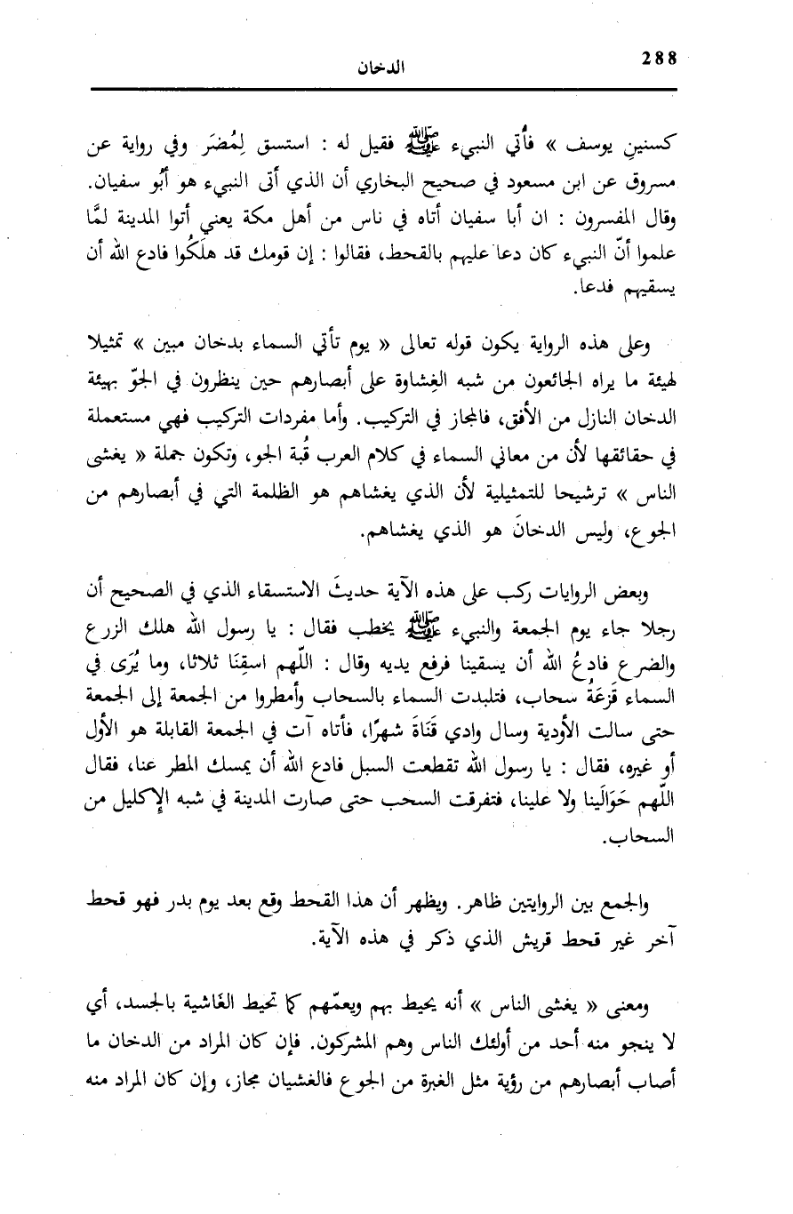 إِنَّ قَوْمَكَ قَدْ هَلَكُوا فَادْعُ اللَّهَ أَنْ يَسْقِيَهُمْ فَدَعَا. وَعَلَى هَذِهِ الرِّوَايَةِ يَكُونُ قَوْلُهُ تَعَالَى: يَوْمَ تَأْتِي السَّماءُ بِدُخانٍ مُبِينٍ تَمْثِيلًا لِهَيْئَةِ مَا يَرَاهُ الْجَائِعُونَ مِنْ شِبْهِ الْغِشَاوَةِ عَلَى أَبْصَارِهِمْ حِينَ يَنْظُرُونَ فِي الْجَوِّ بِهَيْئَةِ الدُّخَانِ النَّازِلِ مِنَ الْأُفُقِ، فَالْمَجَازُ فِي التَّرْكِيبِ. وَأَمَّا مُفْرَدَاتُ التَّرْكِيبِ فَهِيَ مُسْتَعْمَلَةٌ فِي حَقَائِقِهَا لِأَنَّ مِنْ مَعَانِي السَّمَاءِ فِي كَلَامِ الْعَرَبِ قُبَّةُ الْجَوِّ، وَتَكُونُ جُمْلَةُ يَغْشَى النَّاسَ تَرْشِيحًا لِلتَّمْثِيلِيَّةِ لِأَنَّ الَّذِي يَغْشَاهُمْ هُوَ الظُّلْمَةُ الَّتِي فِي أَبْصَارِهِمْ مِنَ الْجُوعِ، وَلَيْسَ الدُّخَانُ هُوَ الَّذِي يَغْشَاهُمْ. وَبَعْضُ الرِّوَايَاتِ رَكَّبَ عَلَى هَذِهِ الْآيَةِ حَدِيثَ