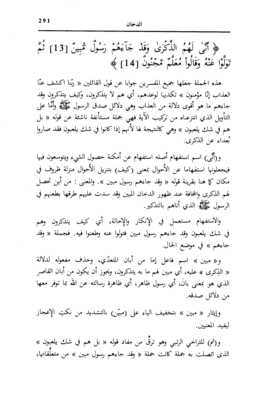 أَنَّى لَهُمُ الذِّكْرى وَقَدْ جاءَهُمْ رَسُولٌ مُبِينٌ (13) ثُمَّ تَوَلَّوْا عَنْهُ وَقالُوا مُعَلَّمٌ مَجْنُونٌ (14)