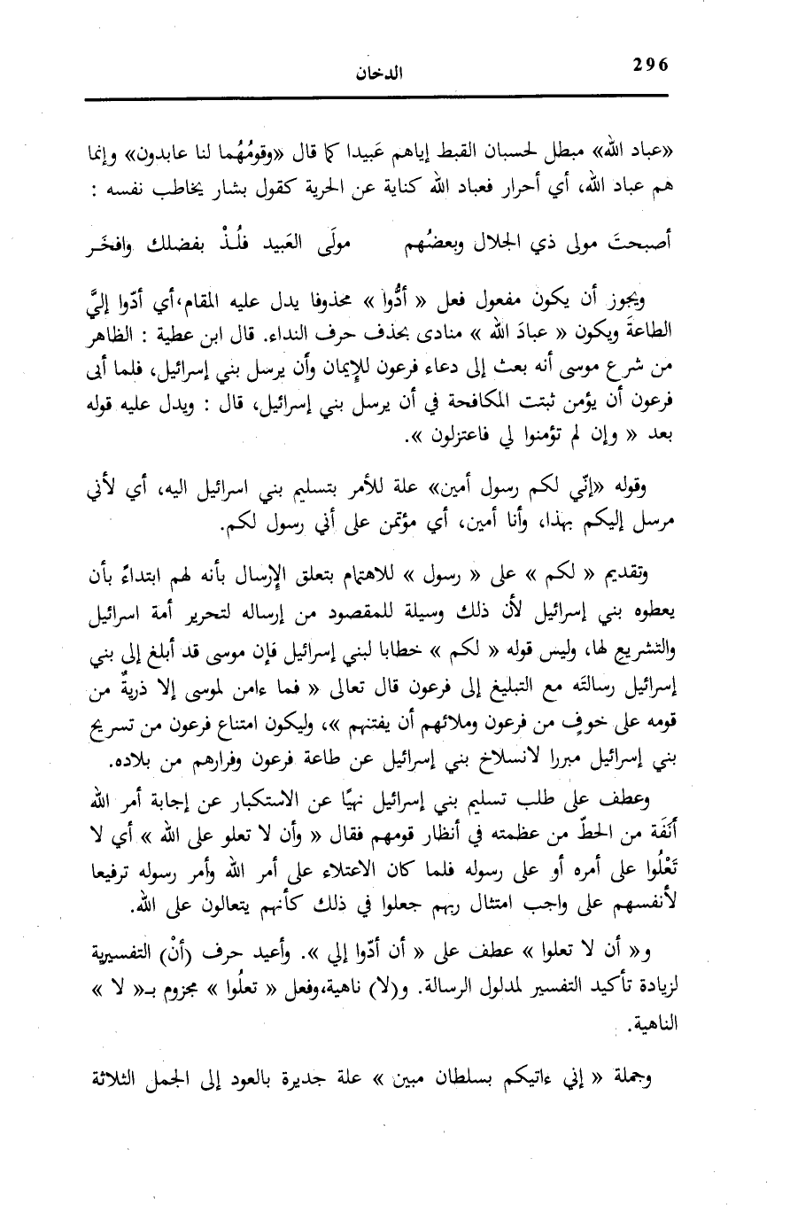 وَيَجُوزُ أَنْ يَكُونَ مَفْعُولُ فِعْلِ أَدُّوا مَحْذُوفًا يَدُلُّ عَلَيْهِ الْمَقَامُ، أَيْ أَدَّوْا إِلَيَّ الطَّاعَةَ وَيَكُونُ عِبادَ اللَّهِ مُنَادَى بِحَذْفِ حَرْفِ النِّدَاءِ. قَالَ ابْنُ عَطِيَّةَ: الظَّاهِرُ مِنْ شَرْعِ مُوسَى أَنَّهُ بُعِثَ إِلَى دُعَاءِ فِرْعَوْنَ لِلْإِيمَانِ وَأَنْ يُرْسِلَ بَنِي إِسْرَائِيلَ، فَلَمَّا أَبَى فِرْعَوْنُ أَنْ يُؤْمِنَ ثَبَتَتِ الْمُكَافَحَةُ فِي أَنْ يُرْسِلَ بَنِي إِسْرَائِيلَ، قَالَ: وَيَدُلُّ عَلَيْهِ قَوْلُهُ بَعْدُ وَإِنْ لَمْ تُؤْمِنُوا لِي فَاعْتَزِلُونِ.
