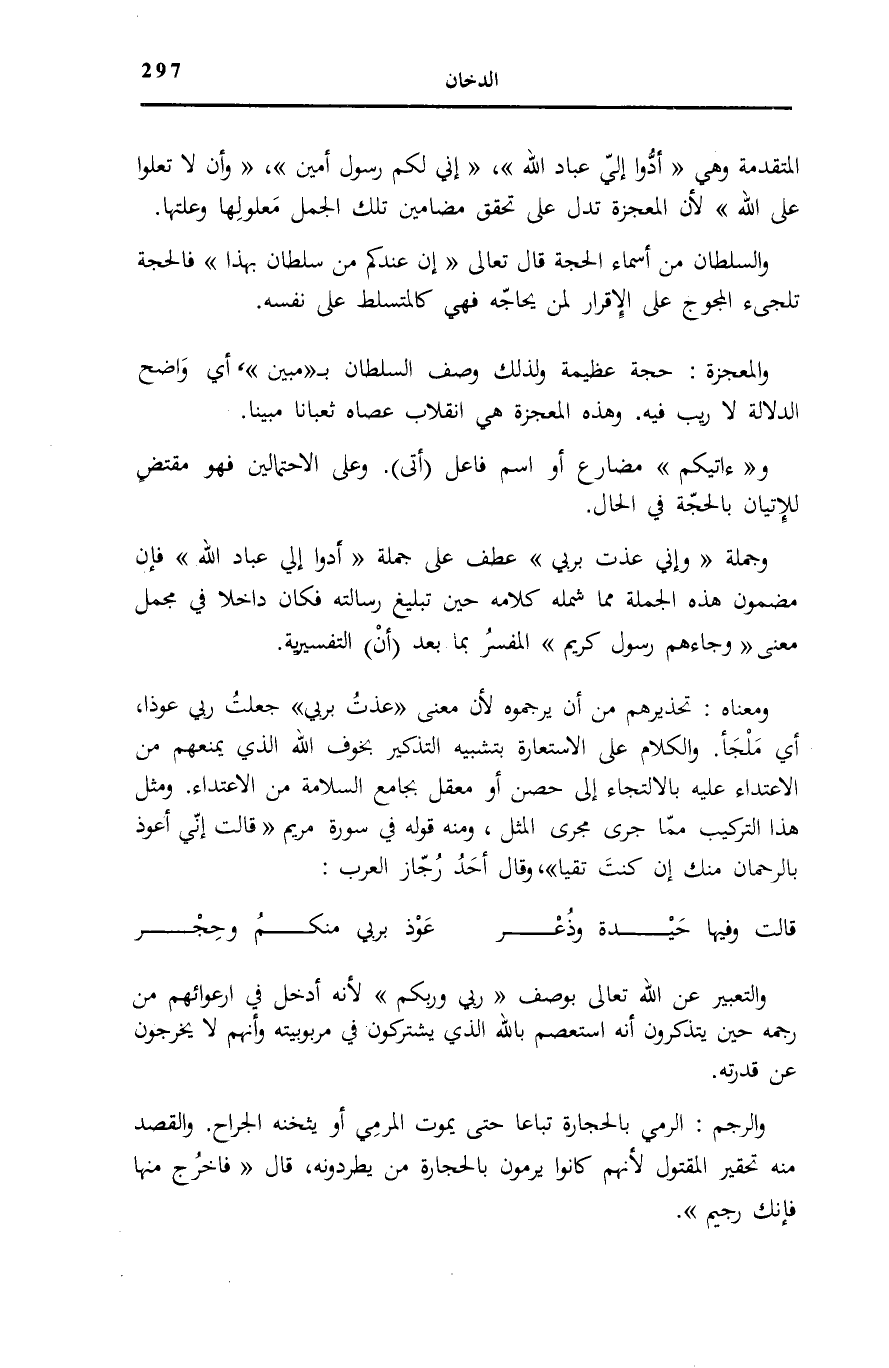 الْمُتَقَدِّمَةِ وَهِيَ أَدُّوا إِلَيَّ عِبادَ اللَّهِ، إِنِّي لَكُمْ رَسُولٌ أَمِينٌ، وَأَنْ لَا تَعْلُوا عَلَى اللَّهِ لِأَنَّ الْمُعْجِزَةَ تَدُلُّ عَلَى تَحَقُّقِ مَضَامِينِ تِلْكَ الْجُمَلِ مَعْلُولِهَا وَعِلَّتِهَا.