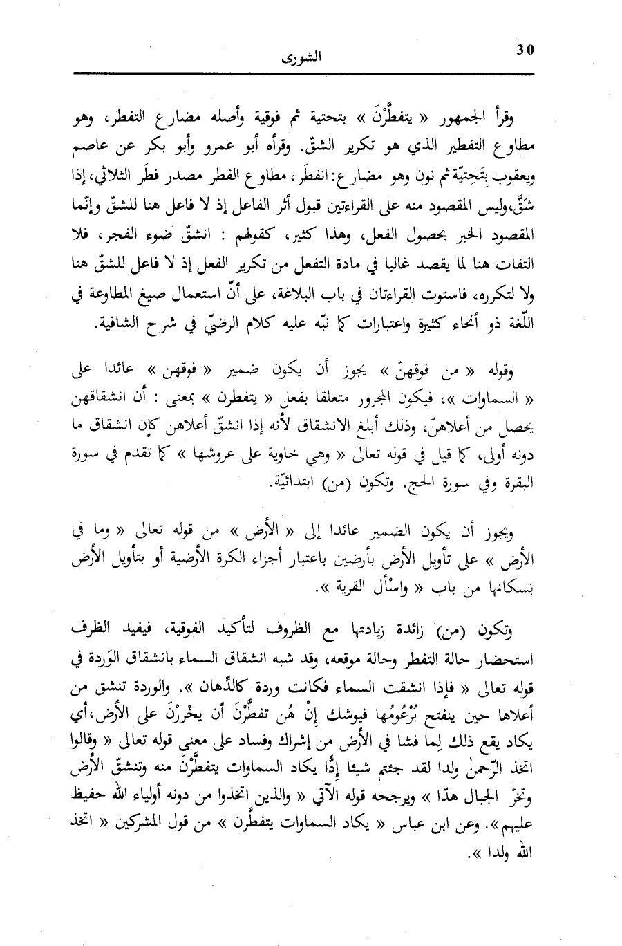 وَتَكُونُ مِنْ زَائِدَةً زِيَادَتَهَا مَعَ الظُّرُوفِ لِتَأْكِيدِ الْفَوْقِيَّةِ، فَيُفِيدُ الظَّرْفُ اسْتِحْضَارَ حَالَةِ التَّفَطُّرِ وَحَالَةِ مَوْقِعِهِ، وَقَدْ شُبِّهَ انْشِقَاقُ السَّمَاءِ بِانْشِقَاقِ الْوَرْدَةِ فِي قَوْلِهِ تَعَالَى: فَإِذَا انْشَقَّتِ السَّماءُ فَكانَتْ وَرْدَةً كَالدِّهانِ [الرَّحْمَن: 37] . وَالْوَرْدَةُ تَنْشَقُّ مِنْ أَعْلَاهَا حِينَ يَنْفَتِحُ بِرْعُومُهَا فَيُوشِكُ إِنْ هُنَّ تَفَطَّرْنَ أَنْ يَخْرِرْنَ عَلَى الْأَرْضِ، أَيْ يَكَادُ يَقَعُ ذَلِكَ لِمَا فَشَا فِي الْأَرْضِ مِنْ إِشْرَاكٍ وَفَسَادٍ عَلَى مَعْنَى قَوْلِهِ تَعَالَى: وَقالُوا اتَّخَذَ الرَّحْمنُ وَلَداً لَقَدْ جِئْتُمْ شَيْئاً إِدًّا يَكَادُ السَّماواتُ يَتَفَطَّرْنَ مِنْهُ وَتَنْشَقُّ الْأَرْضُ وَتَخِرُّ الْجِبالُ هَدًّا [مَرْيَم: 88- 90] وَيُرَجِّحُهُ قَوْلُهُ الْآتِي: وَالَّذِينَ اتَّخَذُوا مِنْ دُونِهِ أَوْلِياءَ اللَّهُ حَفِيظٌ عَلَيْهِمْ [الشورى: 6] . وَعَنِ ابْنِ عَبَّاسٍ يَكَادُ السَّماواتُ يَتَفَطَّرْنَ مِنْ قَوْلِ الْمُشْرِكِينَ اتَّخَذَ اللَّهُ وَلَداً [الْبَقَرَة: 116] .