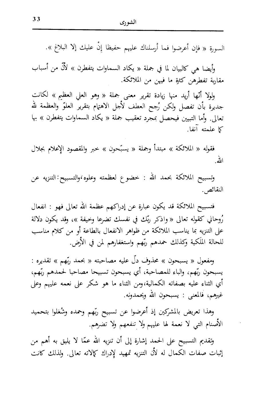 وَمَفْعُولُ يُسَبِّحُونَ مَحْذُوفٌ دَلَّ عَلَيْهِ مُصَاحَبَتُهُ بِحَمْدِ رَبِّهِمْ [الشورى: 5] تَقْدِيرُهُ: يُسَبِّحُونَ رَبَّهُمْ، وَالْبَاءُ لِلْمُصَاحَبَةِ، أَيْ يُسَبِّحُونَ تَسْبِيحًا مُصَاحِبًا لِحَمْدِهِمْ رَبَّهُمْ، أَيِ الثَّنَاءُ عَلَيْهِ بِصِفَاتِهِ الْكَمَالِيَّةِ، وَمِنَ الثَّنَاءِ مَا هُوَ شُكْرٌ عَلَى نِعَمِهِ عَلَيْهِمْ وَعَلَى غَيْرِهِمْ، فَالْمَعْنَى: يُسَبِّحُونَ اللَّهَ وَيَحْمَدُونَهُ. وَهَذَا تَعْرِيضٌ بِالْمُشْرِكِينَ إِذْ أَعْرَضُوا عَنْ تَسْبِيحِ رَبِّهِمْ وَحَمْدِهِ وَشُغِلُوا بِتَحْمِيدِ الْأَصْنَامِ الَّتِي لَا نِعْمَةَ لَهَا عَلَيْهِمْ وَلَا تَنْفَعُهُمْ وَلَا تَضُرُّهُمْ.
