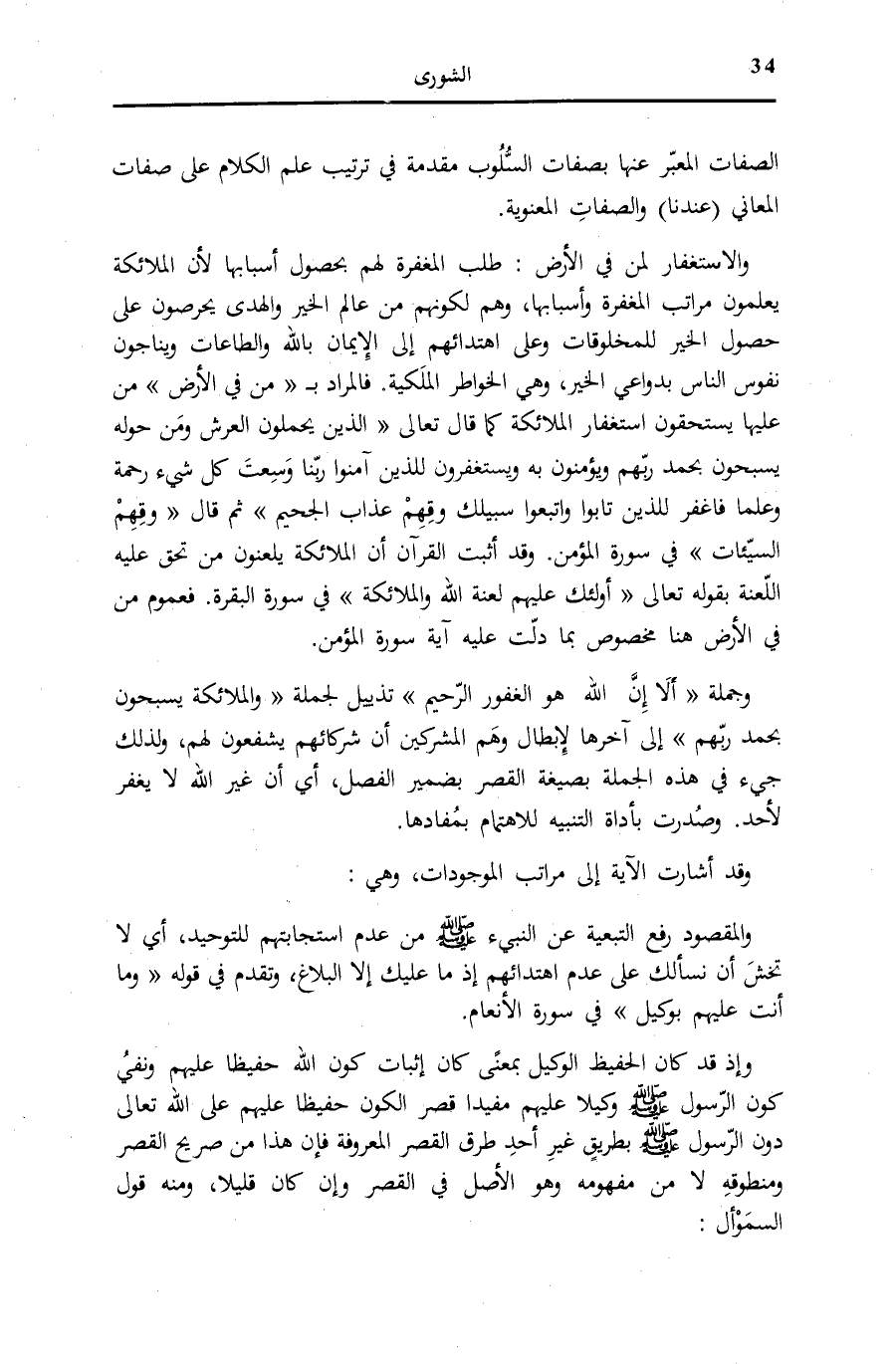 وَالِاسْتِغْفَارُ لِمَنْ فِي الْأَرْضِ: طَلَبُ الْمَغْفِرَةِ لَهُمْ بِحُصُولِ أَسْبَابِهَا لِأَنَّ الْمَلَائِكَةَ يَعْلَمُونَ مَرَاتِبَ الْمَغْفِرَةِ وَأَسْبَابَهَا، وَهُمْ لِكَوْنِهِمْ مِنْ عَالَمِ الْخَيْرِ وَالْهُدَى يَحْرِصُونَ عَلَى حُصُولِ الْخَيْرِ لِلْمَخْلُوقَاتِ وَعَلَى اهْتِدَائِهِمْ إِلَى الْإِيمَانِ بِاللَّهِ وَالطَّاعَاتِ وَيُنَاجُونَ نُفُوسَ النَّاسِ بِدَوَاعِي الْخَيْرِ، وَهِيَ الْخَوَاطِرُ الْمَلَكِيَّةُ. فَالْمُرَاد ب لِمَنْ فِي الْأَرْضِ [الشورى: 5] مَنْ عَلَيْهَا يَسْتَحِقُّونَ اسْتِغْفَارَ الْمَلَائِكَةِ كَمَا قَالَ تَعَالَى: الَّذِينَ يَحْمِلُونَ الْعَرْشَ وَمَنْ حَوْلَهُ يُسَبِّحُونَ بِحَمْدِ رَبِّهِمْ وَيُؤْمِنُونَ بِهِ وَيَسْتَغْفِرُونَ لِلَّذِينَ آمَنُوا رَبَّنا وَسِعْتَ كُلَّ شَيْءٍ رَحْمَةً وَعِلْماً فَاغْفِرْ لِلَّذِينَ تابُوا وَاتَّبَعُوا سَبِيلَكَ وَقِهِمْ عَذابَ الْجَحِيمِ [غَافِر: 7] ثُمَّ قَالَ: وَقِهِمُ السَّيِّئاتِ فِي سُورَةِ الْمُؤْمِنِ [9] . وَقَدْ أَثْبَتَ الْقُرْآنُ أَنَّ الْمَلَائِكَةَ يَلْعَنُونَ مَنْ تَحِقُّ عَلَيْهِ اللَّعْنَةُ بَقَوْلِهِ تَعَالَى: أُولئِكَ عَلَيْهِمْ لَعْنَةُ اللَّهِ وَالْمَلائِكَةِ فِي سُورَةِ الْبَقَرَةِ [161] . فَعُمُومُ مَنْ فِي الْأَرْضِ هُنَا مَخْصُوصٌ بِمَا دَلَّتْ عَلَيْهِ آيَةُ سُورَةِ الْمُؤْمِنِ.