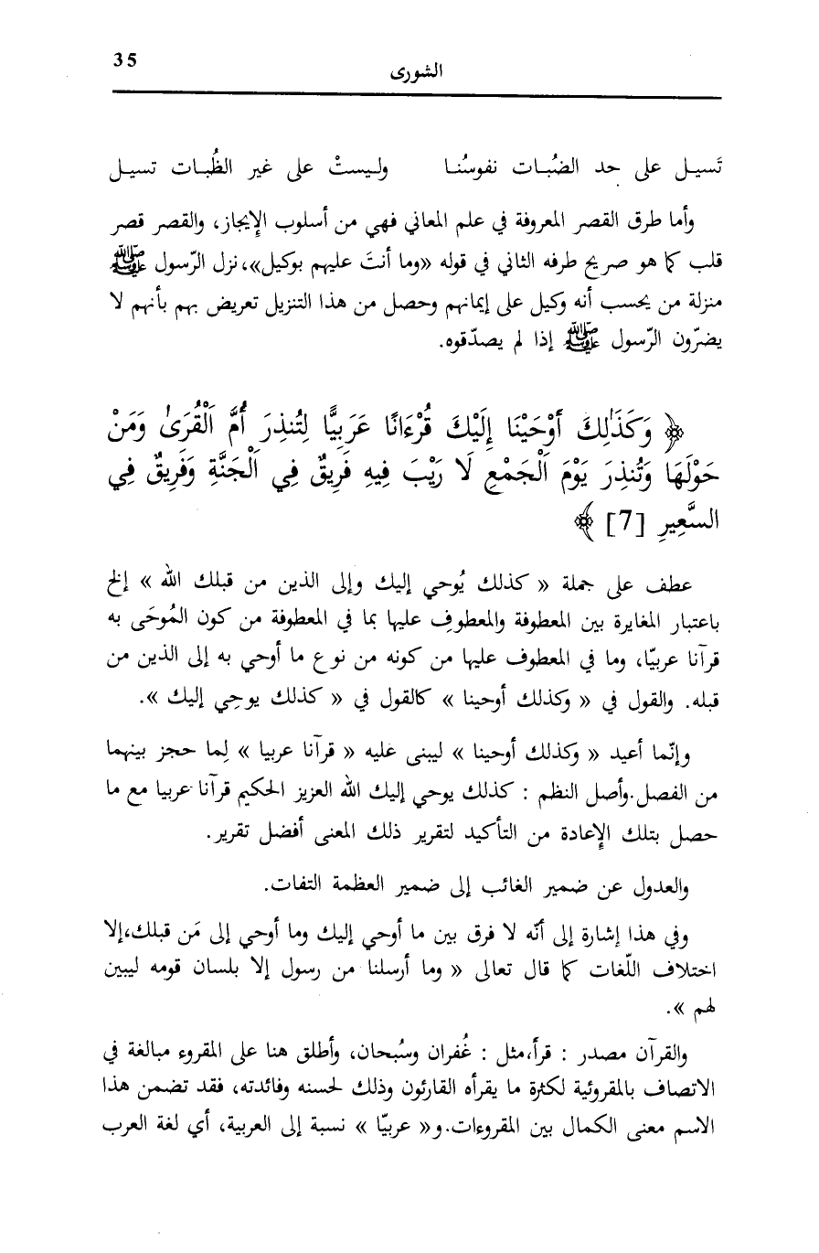 وَإِنَّمَا أُعِيدَ وَكَذلِكَ أَوْحَيْنا لِيُبْنَى عَلَيْهِ قُرْآناً عَرَبِيًّا لِمَا حَجَزَ بَيْنَهُمَا مِنَ الْفَصْلِ وَأَصْلُ النَّظْمِ: كَذَلِكَ يُوحِي إِلَيْكَ اللَّهُ الْعَزِيزُ الْحَكِيمُ قُرْآنًا عَرَبِيًّا مَعَ مَا حَصَلَ بِتِلْكَ الْإِعَادَةِ مِنَ التَّأْكِيدِ لِتَقْرِيرِ ذَلِكَ الْمَعْنَى أَفْضَلَ تَقْرِيرٍ.