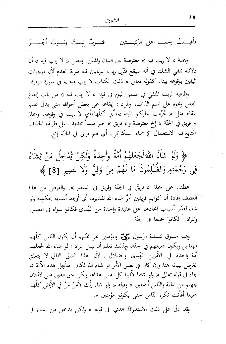 وَجُمْلَةُ لَا رَيْبَ فِيهِ مُعْتَرِضَةٌ بَيْنَ الْبَيَانِ وَالْمُبَيَّنِ. وَمَعْنَى لَا رَيْبَ فِيهِ أَنَّ دَلَائِلَهُ تَنْفِي الشَّكَّ فِي أَنَّهُ سَيَقَعُ فَنَزَّلَ ريب المرتابين فِي مَنْزِلَةَ الْعَدَمِ لِأَنَّ مُوجِبَاتِ الْيَقِينَ بِوُقُوعِهِ بَيِّنَةٌ كَقَوْلِهِ تَعَالَى: ذلِكَ الْكِتابُ لَا رَيْبَ فِيهِ فِي سُورَةِ الْبَقَرَةِ [2] . وَظَرْفِيَّةُ الرَّيْبِ الْمَنْفِيِّ فِي ضَمِيرِ الْيَوْمِ فِي قَوْلِهِ: لَا رَيْبَ فِيهِ مِنْ بَابِ إِيقَاعِ الْفِعْلِ وَنَحْوِهِ عَلَى اسْمِ الذَّاتِ، وَالْمُرَادُ: إِيقَاعُهُ عَلَى بَعْضِ أَحْوَالِهَا الَّتِي يَدُلُّ عَلَيْهَا الْمَقَامُ مِثْلَ حُرِّمَتْ عَلَيْكُمُ الْمَيْتَةُ [الْمَائِدَة: 3] ، أَيْ أَكْلُهَا، أَيْ لَا رَيْبَ فِي وُقُوعِهِ. وَجُمْلَةُ فَرِيقٌ فِي الْجَنَّةِ إِلَخْ مُعْتَرِضَةٌ وفَرِيقٌ خَبَرُ مُبْتَدَأٍ مَحْذُوفٍ عَلَى طَرِيقَةِ الْحَذْفِ الْمُتَابَعِ فِيهِ الِاسْتِعْمَالُ كَمَا سَمَّاهُ السَّكَّاكِيُّ، أَيْ هُمْ فَرِيقٌ فِي الجنّة إِلَخ.