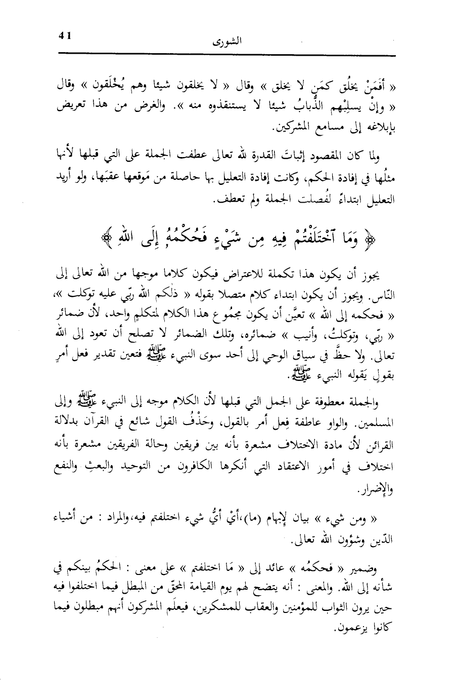 وَيَجُوزُ أَنْ يَكُونَ ابْتِدَاءَ كَلَامٍ مُتَّصِلًا بَقَوْلِهِ: ذلِكُمُ اللَّهُ رَبِّي عَلَيْهِ تَوَكَّلْتُ، فَحُكْمُهُ إِلَى اللَّهِ تَعَيَّنَ أَنْ يَكُونَ مَجْمُوعُ هَذَا الْكَلَامِ لِمُتَكَلِّمٍ وَاحِدٍ، لِأَنَّ ضَمَائِرَ رَبِّي، وتَوَكَّلْتُ، وأُنِيبُ ضَمَائِرُهُ، وَتِلْكَ الضَّمَائِرُ لَا تَصْلُحُ أَنْ تَعُودَ إِلَى اللَّهِ تَعَالَى. وَلَا حَظَّ فِي سِيَاقِ الْوَحْيِ إِلَى أَحَدٍ سوى النبيء صَلَّى اللهُ عَلَيْهِ وَسَلَّمَ فَتَعَيَّنَ تَقْدِيرُ فِعْلِ أَمْرٍ بِقَوْلٍ يَقُوله النبيء صَلَّى اللهُ عَلَيْهِ وَسَلَّمَ.