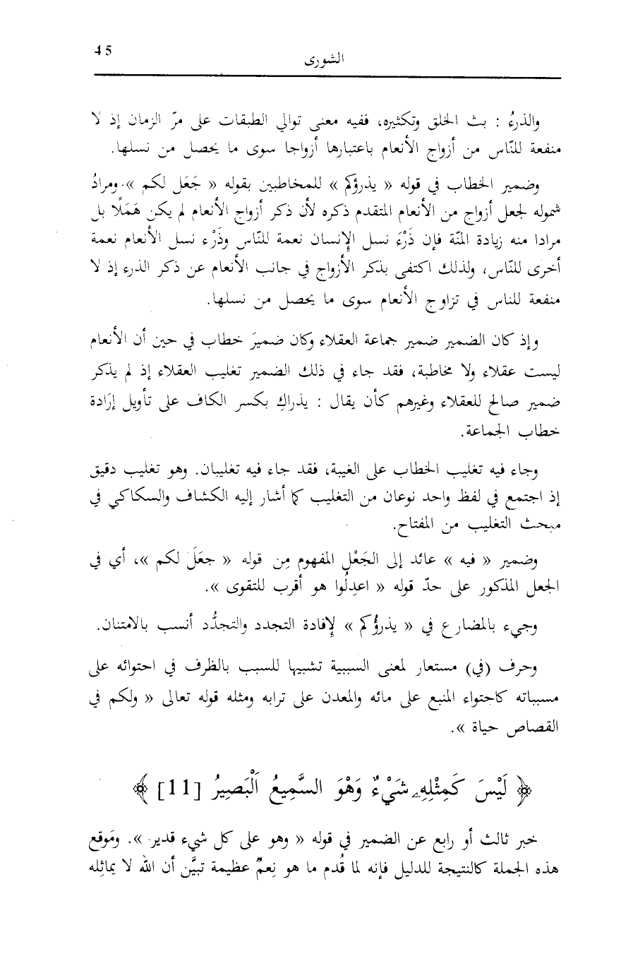 وَضَمِيرُ الْخِطَابِ فِي قَوْلِهِ: يَذْرَؤُكُمْ لِلْمُخَاطَبِينَ بَقَوْلِهِ: جَعَلَ لَكُمْ. وَمُرَادُ شُمُولِهِ لِجَعْلِ أَزْوَاجٍ مِنَ الْأَنْعَامِ الْمُتَقَدِّمِ ذِكْرُهُ لِأَنَّ ذِكْرَ أَزْوَاجِ الْأَنْعَامِ لَمْ يَكُنْ هَمَلًا بَلْ مُرَادًا مِنْهُ زِيَادَةُ الْمِنَّةِ فَإِنَّ ذَرْءَ نَسْلِ الْإِنْسَانِ نِعْمَةٌ لِلنَّاسِ وَذَرْءَ نَسْلِ الْأَنْعَامِ نِعْمَةٌ أُخْرَى لِلنَّاسِ، وَلِذَلِكَ اكْتَفَى بِذِكْرِ الْأَزْوَاجِ فِي جَانِبِ الْأَنْعَامِ عَنْ ذِكْرِ الذَّرْءِ إِذْ لَا مَنْفَعَةَ لِلنَّاسِ فِي تَزَاوُجِ الْأَنْعَامِ سِوَى مَا يَحْصُلُ مِنْ نَسْلِهَا. وَإِذْ كَانَ الضَّمِيرُ ضَمِيرَ جَمَاعَةِ الْعُقَلَاءِ وَكَانَ ضَمِيرَ خِطَابٍ فِي حِينِ أَنَّ الْأَنْعَامَ لَيْسَتْ عُقَلَاءَ وَلَا مُخَاطَبَةً، فَقَدْ جَاءَ فِي ذَلِكَ الضَّمِيرِ تَغْلِيبُ الْعُقَلَاءِ إِذْ لَمْ يُذْكَرْ ضَمِيرٌ صَالِحٌ لِلْعُقَلَاءِ وَغَيْرِهِمْ كَأَنْ يُقَالَ: يَذَرَاكِ بِكَسْرِ الْكَافِ عَلَى تَأْوِيلِ إِرَادَةِ خِطَابِ الْجَمَاعَةِ.