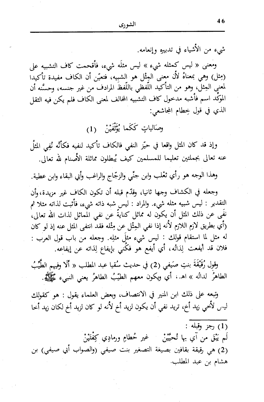 وَصَالِيَاتٍ كَكَمَا يُؤَثْفَيْنْ (¬1) وَإِذْ قَدْ كَانَ الْمَثَلُ وَاقِعًا فِي حَيِّزِ النَّفْيِ فَالْكَافُ تَأْكِيدٌ لِنَفْيِهِ فَكَأَنَّهُ نَفَى الْمِثْلَ عَنْهُ تَعَالَى بِجُمْلَتَيْنِ تَعْلِيمًا لِلْمُسْلِمِينَ كَيْفَ يُبْطِلُونَ مُمَاثَلَةَ الْأَصْنَامِ لِلَّهِ تَعَالَى. وَهَذَا الْوَجْهُ هُوَ رَأْيُ ثَعْلَبٍ وَابْنِ جِنِّيٍّ وَالزَّجَّاجِ وَالرَّاغِبِ وَأَبِي الْبَقَاءِ وَابْنِ عَطِيَّةَ.