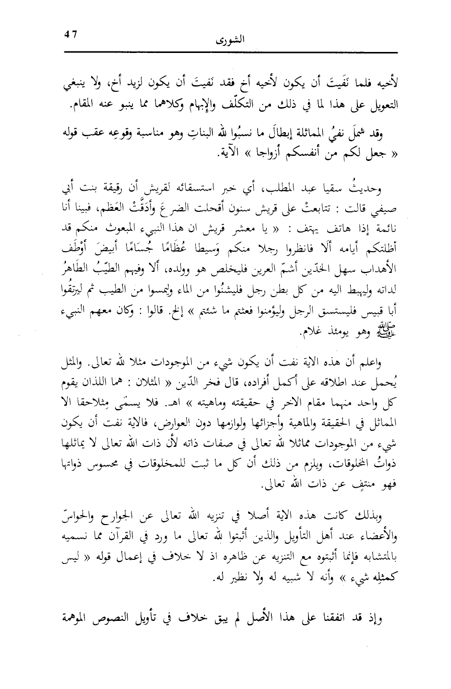 وَبِذَلِكَ كَانَتْ هَذِهِ الْآيَةُ أَصْلًا فِي تَنْزِيهِ اللَّهِ تَعَالَى عَنِ الْجَوَارِحِ وَالْحَوَاسِّ وَالْأَعْضَاءِ عِنْدَ أَهْلِ التَّأْوِيلِ وَالَّذِينَ أَثْبَتُوا لِلَّهِ تَعَالَى مَا وَرَدَ فِي الْقُرْآنِ مِمَّا نُسَمِّيهِ بِالْمُتَشَابِهِ فَإِنَّمَا أَثْبَتُوهُ مَعَ التَّنْزِيهِ عَنْ ظَاهِرِهِ إِذْ لَا خِلَافَ فِي إِعْمَالِ قَوْلِهِ: لَيْسَ كَمِثْلِهِ شَيْءٌ وَأَنَّهُ لَا شَبِيهَ لَهُ وَلَا نَظِيرَ لَهُ.