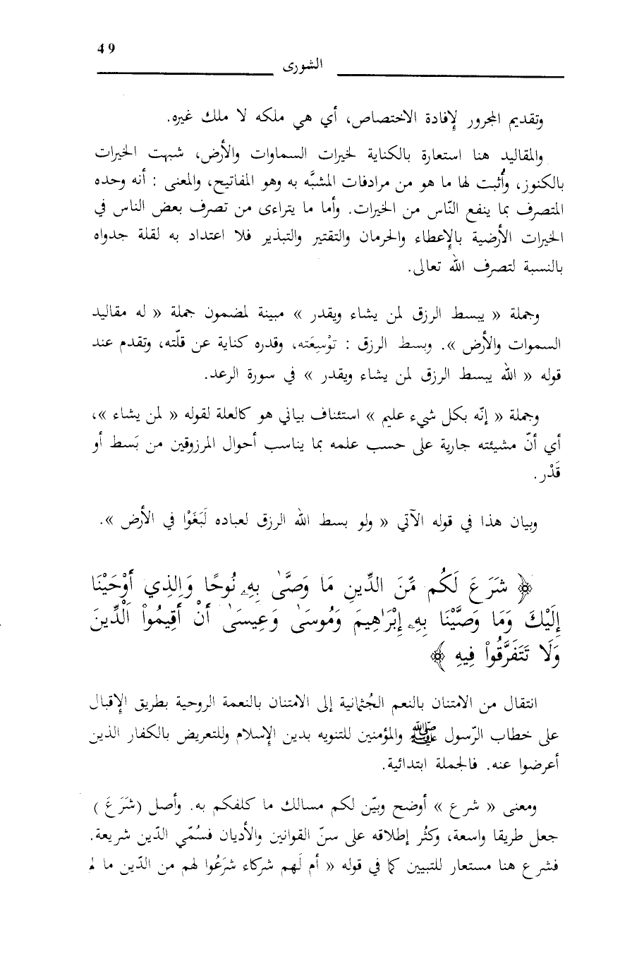 شَرَعَ لَكُمْ مِنَ الدِّينِ مَا وَصَّى بِهِ نُوحاً وَالَّذِي أَوْحَيْنا إِلَيْكَ وَما وَصَّيْنا بِهِ إِبْراهِيمَ وَمُوسى وَعِيسى أَنْ أَقِيمُوا الدِّينَ وَلا تَتَفَرَّقُوا فِيهِ كَبُرَ عَلَى الْمُشْرِكِينَ مَا تَدْعُوهُمْ إِلَيْهِ اللَّهُ يَجْتَبِي إِلَيْهِ مَنْ يَشاءُ وَيَهْدِي إِلَيْهِ مَنْ يُنِيبُ (13)