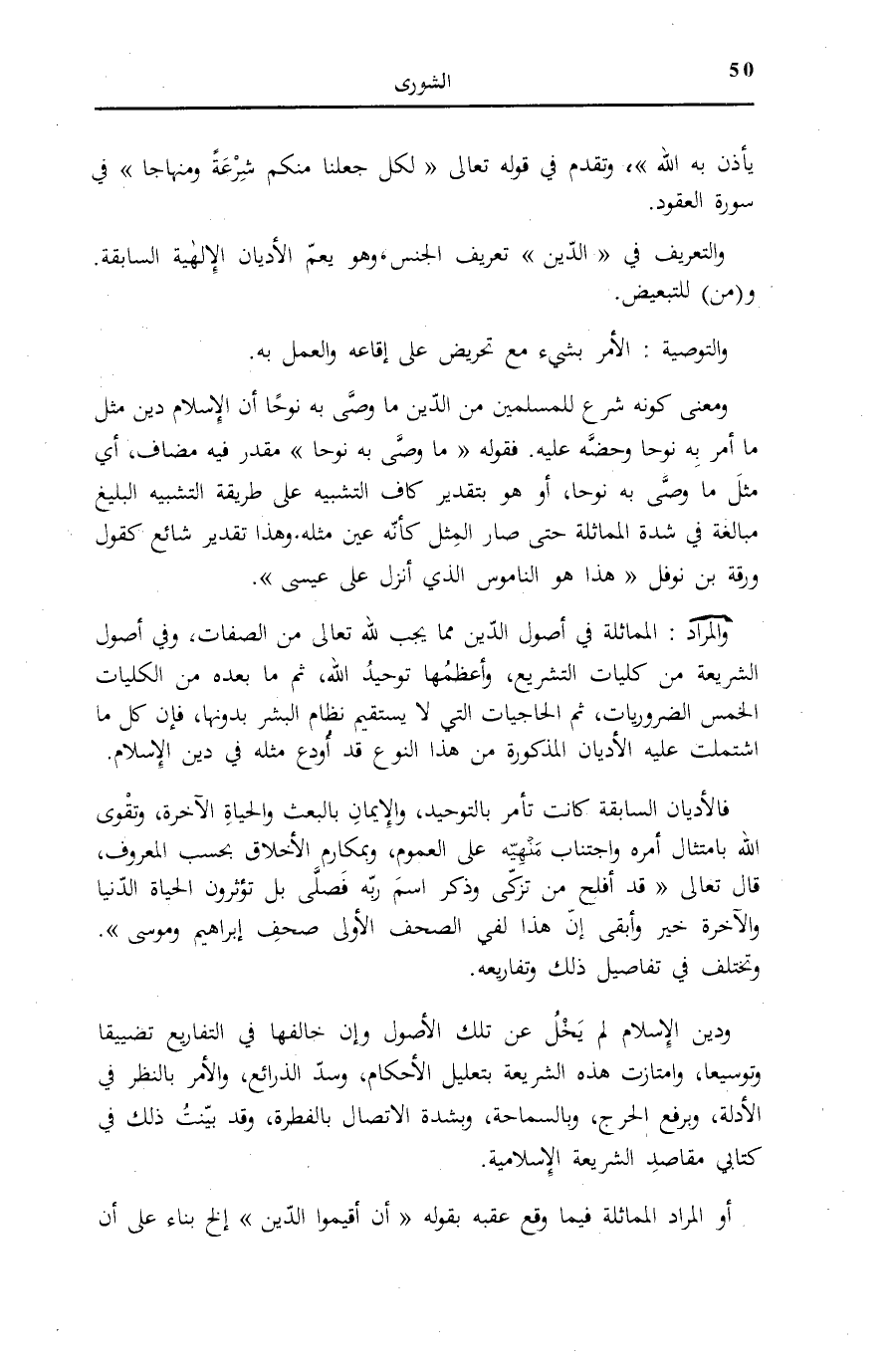 وَالْمُرَادُ: الْمُمَاثَلَةُ فِي أُصُولِ الدِّينِ مِمَّا يَجِبُ لِلَّهِ تَعَالَى مِنَ الصِّفَاتِ، وَفِي أُصُولِ الشَّرِيعَةِ مِنْ كُلِّيَّاتِ التَّشْرِيعِ، وَأَعْظَمُهَا تَوْحِيدُ اللَّهِ، ثُمَّ مَا بَعْدَهُ مِنَ الْكُلِّيَّاتِ الْخَمْسِ