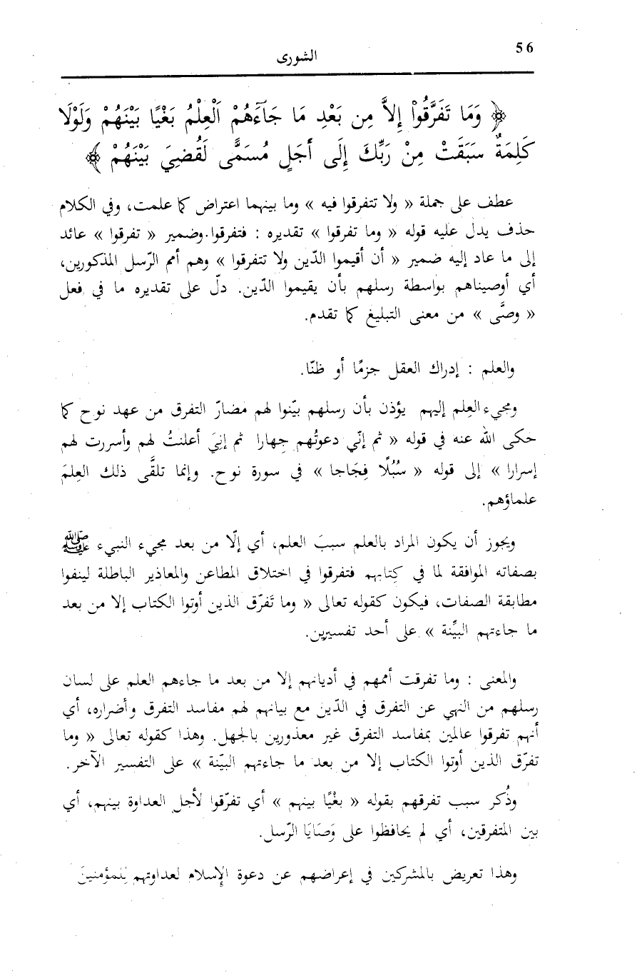 وَما تَفَرَّقُوا إِلاَّ مِنْ بَعْدِ مَا جاءَهُمُ الْعِلْمُ بَغْياً بَيْنَهُمْ وَلَوْلا كَلِمَةٌ سَبَقَتْ مِنْ رَبِّكَ إِلى أَجَلٍ مُسَمًّى لَقُضِيَ بَيْنَهُمْ وَإِنَّ الَّذِينَ أُورِثُوا الْكِتابَ مِنْ بَعْدِهِمْ لَفِي شَكٍّ مِنْهُ مُرِيبٍ (14)
