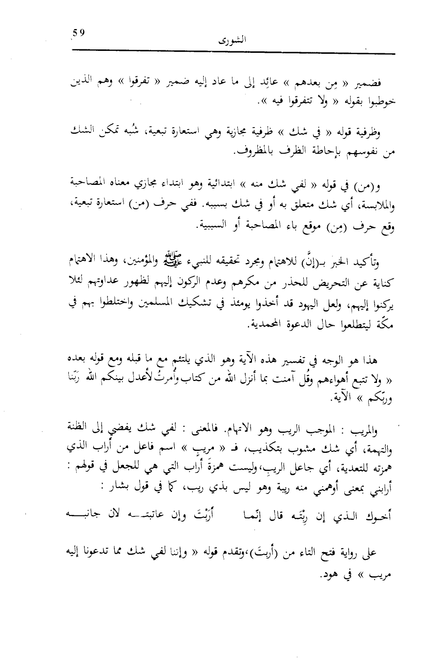 وَ (مِنْ) فِي قَوْلِهِ: لَفِي شَكٍّ مِنْهُ ابْتِدَائِيَّةٌ وَهُوَ ابْتِدَاءٌ مَجَازِيٌّ مَعْنَاهُ الْمُصَاحَبَةُ وَالْمُلَابَسَةُ، أَيْ شَكٌّ مُتَعَلِّقٌ بِهِ أَوْ فِي شَكٍّ بِسَبَبِهِ. فَفِي حَرْفِ (مِنْ) اسْتِعَارَةٌ تَبَعِيَّةٌ، وَقَعَ حَرْفُ (مِنْ) مَوْقِعَ بَاءِ الْمُصَاحَبَةِ أَوِ السَّبَبِيَّةِ.