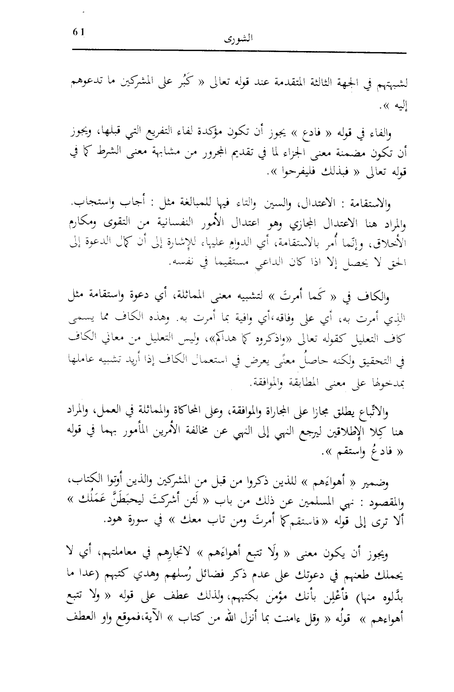 وَالْكَافُ فِي كَما أُمِرْتَ لِتَشْبِيهِ مَعْنَى الْمُمَاثَلَةِ، أَيْ دَعْوَةٌ وَاسْتِقَامَةٌ مِثْلَ الَّذِي أُمِرْتَ بِهِ، أَيْ عَلَى وِفَاقِهِ، أَيْ وَافِيَةٌ بِمَا أُمِرْتَ بِهِ. وَهَذِهِ الْكَافُ مِمَّا يُسَمَّى كَافَ التَّعْلِيلِ كَقَوْلِهِ تَعَالَى: وَاذْكُرُوهُ كَما هَداكُمْ [الْبَقَرَة: 198] ، وَلَيْسَ التَّعْلِيلُ مِنْ مَعَانِي الْكَافِ فِي التَّحْقِيقِ وَلَكِنَّهُ حَاصِلُ مَعْنًى يَعْرِضُ فِي اسْتِعْمَالِ الْكَافِ إِذَا أُرِيدَ تَشْبِيهُ عَامِلِهَا بِمَدْخُولِهَا عَلَى مَعْنَى الْمُطَابَقَةِ وَالْمُوَافَقَةِ.