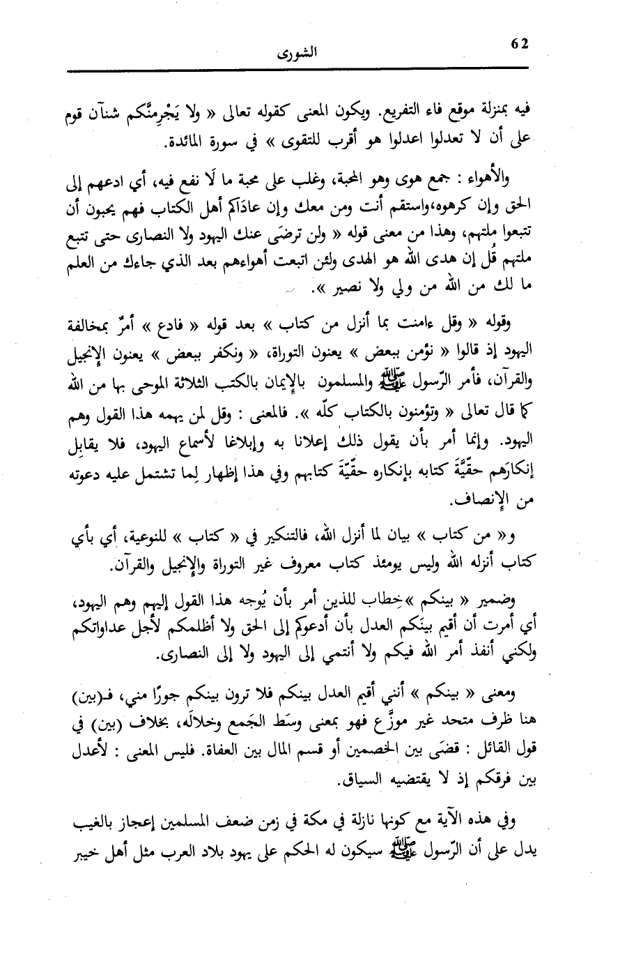 وَضَمِيرُ بَيْنَكُمُ خِطَابٌ لِلَّذِينِ أُمِرَ بِأَنْ يُوَجِّهَ هَذَا الْقَوْلَ إِلَيْهِمْ وَهُمُ الْيَهُودُ، أَيْ أُمِرْتُ أَنْ أُقِيمَ بَيْنَكُمُ الْعَدْلَ بِأَنْ أَدْعُوَكُمْ إِلَى الْحَقِّ وَلَا أَظْلِمَكُمْ لِأَجْلِ عَدَاوَاتِكُمْ وَلَكِنِّي أُنَفِّذُ أَمْرَ اللَّهِ فِيكُمْ وَلَا أَنْتَمِي إِلَى الْيَهُودِ وَلَا إِلَى النَّصَارَى. وَمَعْنَى بَيْنَكُمُ أَنَّنِي أُقِيمُ الْعَدْلَ بَيْنَكُمْ فَلَا تَرَوْنَ بَيْنَكُمْ جَوْرًا مِنِّي، فَ (بَيْنَ) هُنَا ظَرْفٌ مُتَّحِدٌ غَيْرُ مُوَزَّعٍ فَهُوَ بِمَعْنَى وَسَطَ الْجَمْعِ وَخِلَالَهُ، بِخِلَافِ (بَيْنَ) فِي قَوْلِ الْقَائِلِ: قَضَى بَيْنَ الْخَصْمَيْنِ أَوْ قَسَّمَ الْمَالَ بَيْنَ الْعُفَاةِ. فَلَيْسَ الْمَعْنَى: لِأَعْدِلَ بَيْنَ فِرَقِكُمْ إِذْ لَا يَقْتَضِيهِ السِّيَاقُ.