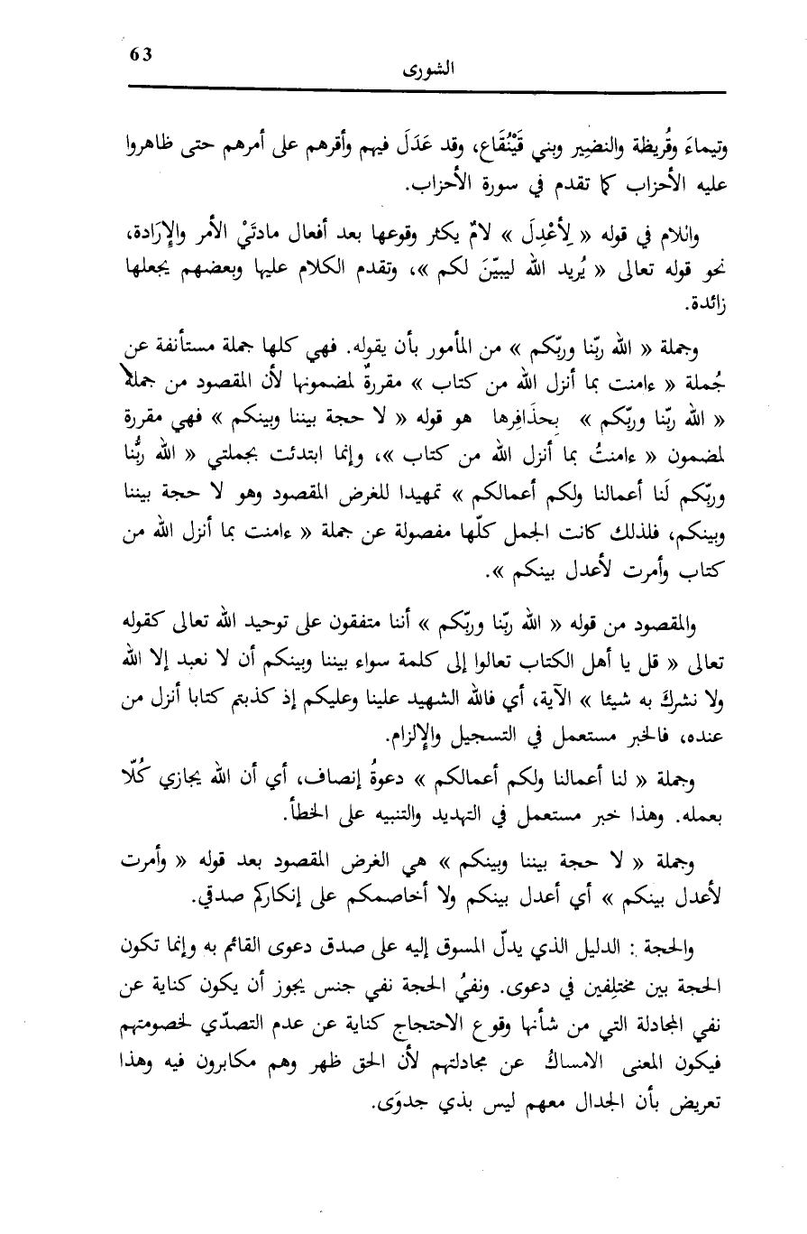 آمَنْتُ بِما أَنْزَلَ اللَّهُ مِنْ كِتابٍ مُقَرِّرَةٌ لِمَضْمُونِهَا لِأَنَّ الْمَقْصُودَ مِنْ جُمْلَةِ اللَّهُ رَبُّنا وَرَبُّكُمْ بِحَذَافِرِهَا هُوَ قَوْلُهُ: لَا حُجَّةَ بَيْنَنا وَبَيْنَكُمُ فَهِيَ مُقَرِّرَةٌ لِمَضْمُونِ آمَنْتُ بِما أَنْزَلَ اللَّهُ مِنْ كِتابٍ، وَإِنَّمَا ابْتُدِئَتْ بِجُمْلَتَيِ اللَّهُ رَبُّنا وَرَبُّكُمْ لَنا أَعْمالُنا وَلَكُمْ أَعْمالُكُمْ تَمْهِيدًا لِلْغَرَضِ الْمَقْصُودِ وَهُوَ لَا حُجَّةَ بَيْنَنَا وَبَيْنَكُمْ، فَلِذَلِكَ كَانَتِ الْجُمَلُ كُلُّهَا مَفْصُولَةً عَنْ جُمْلَةِ آمَنْتُ بِما أَنْزَلَ اللَّهُ مِنْ كِتابٍ وَأُمِرْتُ لِأَعْدِلَ بَيْنَكُمُ.