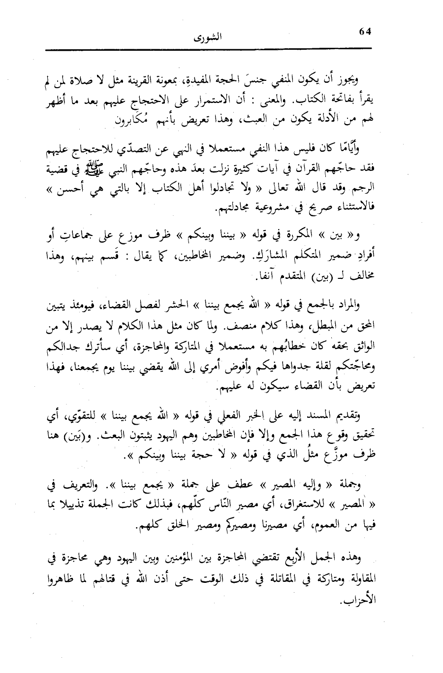 وَيَجُوزُ أَنْ يَكُونَ الْمَنْفِيُّ جِنْسَ الْحُجَّةِ الْمُفِيدَةِ، بِمَعُونَةِ الْقَرِينَةِ مِثْلَ: لَا صَلَاةَ لِمَنْ لَمْ يَقْرَأْ بِفَاتِحَةِ الْكِتَابِ. وَالْمَعْنَى: أَنَّ الِاسْتِمْرَارَ عَلَى الِاحْتِجَاجِ عَلَيْهِمْ بَعْدَ مَا أَظْهَرَ لَهُمْ مِنَ الْأَدِلَّةِ يَكُونُ مِنَ الْعَبَثِ، وَهَذَا تَعْرِيضٌ بِأَنَّهُمْ مُكَابِرُونَ. وَأَيًّا مَا كَانَ فَلَيْسَ هَذَا النَّفْيُ مُسْتَعْمَلًا فِي النَّهْيِ عَنِ التَّصَدِّي لِلِاحْتِجَاجِ عَلَيْهِمْ فَقَدْ حَاجَّهُمُ الْقُرْآنُ فِي آيَاتٍ كَثِيرَةٍ نَزَلَتْ بَعْدَ هَذِهِ وحاجّهم النبيء صَلَّى اللهُ عَلَيْهِ وَسَلَّمَ فِي قَضِيَّةِ الرَّجْمِ وَقَدْ قَالَ اللَّهُ تَعَالَى: وَلا تُجادِلُوا أَهْلَ الْكِتابِ إِلَّا بِالَّتِي هِيَ أَحْسَنُ [العنكبوت: 46] فَالِاسْتِثْنَاءُ صَرِيحٌ فِي مَشْرُوعِيَّةِ مُجَادَلَتِهِمْ.
