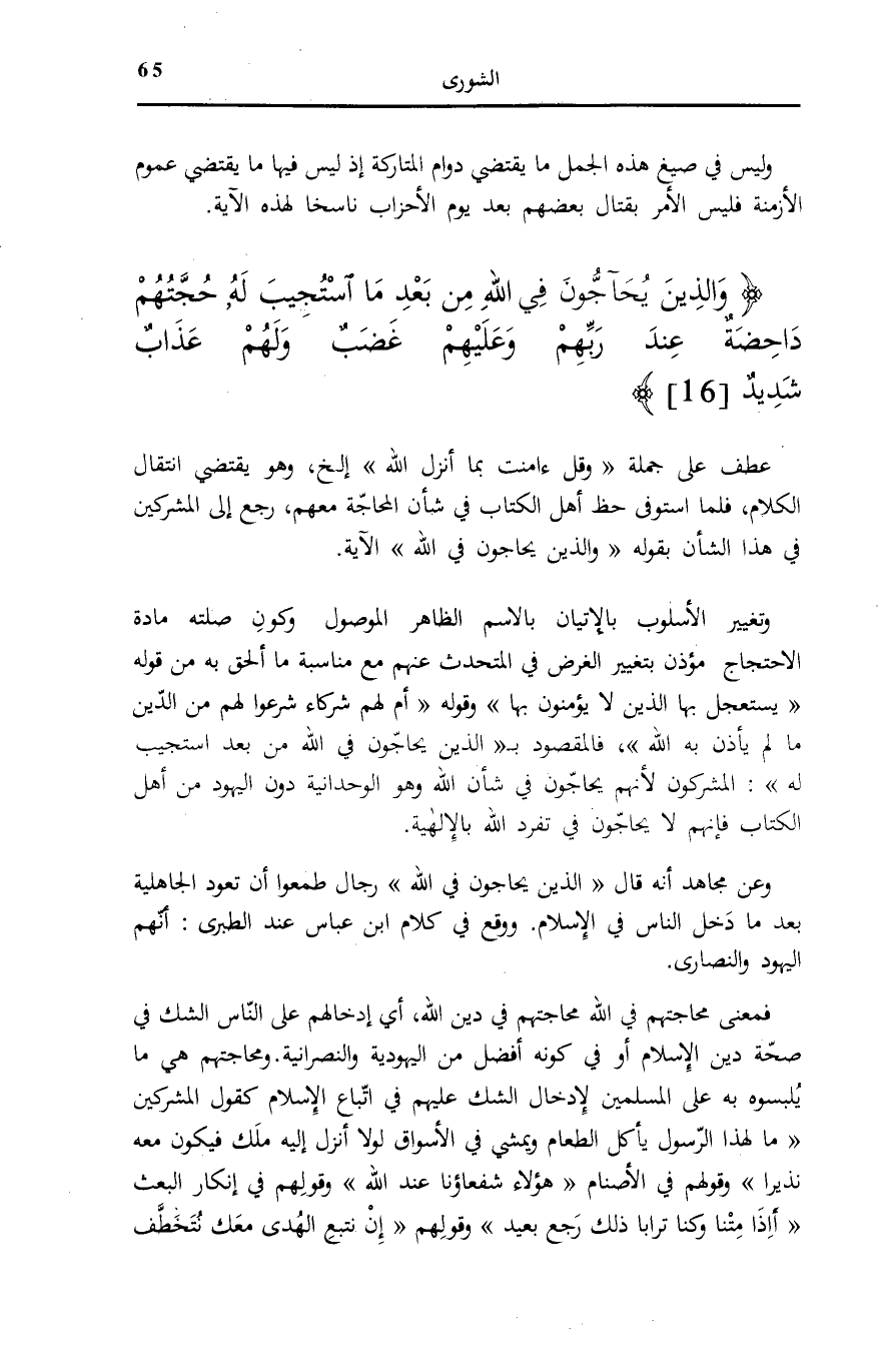 وَتَغْيِيرُ الْأُسْلُوبِ بِالْإِتْيَانِ بِالِاسْمِ الظَّاهِرِ الْمَوْصُولِ وَكَوْنِ صِلَتِهِ مَادَّةَ الِاحْتِجَاجِ مُؤْذِنٌ بِتَغْيِيرِ الْغَرَضِ فِي الْمُتَحَدِّثِ عَنْهُمْ مَعَ مُنَاسَبَةِ مَا أُلْحِقَ بِهِ مِنْ قَوْلِهِ: يَسْتَعْجِلُ بِهَا الَّذِينَ لَا يُؤْمِنُونَ بِها [الشورى: 18] وَقَوْلُهُ: أَمْ لَهُمْ شُرَكاءُ شَرَعُوا لَهُمْ مِنَ الدِّينِ مَا لَمْ يَأْذَنْ بِهِ اللَّهُ [الشورى: 21] ، فَالْمَقْصُودُ بِ الَّذِينَ يُحَاجُّونَ فِي اللَّهِ مِنْ بَعْدِ مَا اسْتُجِيبَ لَهُ: الْمُشْرِكُونَ لِأَنَّهُمْ يُحَاجُّونَ فِي شَأْنِ اللَّهِ وَهُوَ الْوَحْدَانِيَّةُ دُونَ الْيَهُودِ مِنْ أَهْلِ الْكِتَابِ فَإِنَّهُمْ لَا يُحَاجُّونَ فِي تَفَرُّدِ اللَّهِ بِالْإِلَهِيَّةِ. وَعَنْ مُجَاهِدٍ أَنَّهُ قَالَ: الَّذِينَ يُحَاجُّونَ فِي اللَّهِ رِجَالٌ طَمِعُوا أَنْ