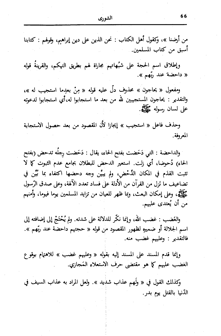 وَكَقَوْلِ أَهْلِ الْكِتَابِ: نَحْنُ الَّذِينَ عَلَى دِينِ إِبْرَاهِيمَ، وَقَوْلِهِمْ: كِتَابُنَا أَسْبَقُ مِنْ كِتَابِ الْمُسْلِمِينَ. وَإِطْلَاقُ اسْمِ الْحُجَّةِ عَلَى شُبُهَاتِهِمْ مُجَارَاةٌ لَهُمْ بِطَرِيقِ التَّهَكُّمِ، وَالْقَرِينَةُ قَوْلُهُ داحِضَةٌ عِنْدَ رَبِّهِمْ.