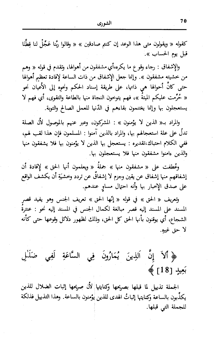 وَعُطِفَتْ عَلَى مُشْفِقُونَ مِنْها جُمْلَةُ وَيَعْلَمُونَ أَنَّهَا الْحَقُّ لِإِفَادَةِ أَنَّ إِشْفَاقَهُمْ مِنْهَا إِشْفَاقٌ عَنْ يَقِينٍ وَجَزْمٍ لَا إِشْفَاقٌ عَنْ تَرَدُّدٍ وَخَشْيَةِ أَنْ يَكْشِفَ الْوَاقِعُ عَلَى صِدْقِ الْإِخْبَارِ بِهَا وَأَنَّهُ احْتِمَالٌ مُسَاوٍ عِنْدَهُمْ. وَتَعْرِيفُ الْحَقُّ فِي قَوْلِهِ: أَنَّهَا الْحَقُّ تَعْرِيفُ الْجِنْسِ وَهُوَ يُفِيدُ قَصْرَ الْمُسْنَدِ عَلَى الْمُسْنَدِ إِلَيْهِ قَصْرَ مُبَالَغَةٍ لِكَمَالِ الْجِنْسِ فِي الْمُسْنَدِ إِلَيْهِ نَحْوَ: عَنْتَرَةُ الشُّجَاعُ، أَيْ يُوقِنُونَ بِأَنَّهَا الْحَقُّ كُلَّ الْحَقِّ، وَذَلِكَ لِظُهُورِ دَلَائِلِ وُقُوعِهَا حَتَّى كَأَنَّهُ لَا حَقَّ غَيْرُهُ.