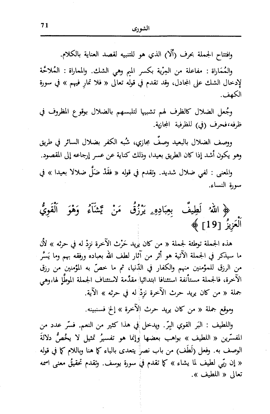 هَذِهِ الْجُمْلَةُ تَوْطِئَةٌ لِجُمْلَةِ مَنْ كانَ يُرِيدُ حَرْثَ الْآخِرَةِ نَزِدْ لَهُ فِي حَرْثِهِ [الشورى: 20] لِأَنَّ مَا سَيُذْكَرُ فِي الْجُمْلَةِ الْآتِيَةِ هُوَ أَثَرٌ مِنْ آثَارِ لُطْفِ اللَّهِ بِعِبَادِهِ وَرِفْقِهِ بِهِمْ وَمَا يَسَّرَ مِنَ الرِّزْقِ لِلْمُؤْمِنِينَ مِنْهُمْ وَالْكُفَّارِ فِي الدُّنْيَا، ثُمَّ مَا خَصَّ بِهِ الْمُؤْمِنِينَ مِنْ رِزْقِ الْآخِرَةِ، فَالْجُمْلَةُ مُسْتَأْنَفَةٌ اسْتِئْنَافًا ابْتِدَائِيًّا مُقَدَّمَةٌ لِاسْتِئْنَافِ الْجُمْلَةِ الْمُوَطَّأِ لَهَا، وَهِيَ جُمْلَةُ مَنْ كانَ