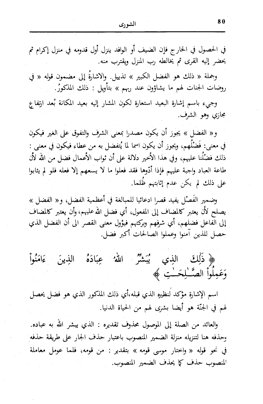 وَضَمِيرُ الْفَصْلِ يُفِيدُ قَصْرًا ادِّعَائِيًّا لِلْمُبَالَغَةِ فِي أَعَظْمِيَّةِ الْفَضْلِ، والْفَضْلُ يَصْلُحُ لِأَنَّ يُعْتَبَرُ كَالْمُضَافِ إِلَى الْمَفْعُولِ، أَيْ فَضْلُ اللَّهِ عَلَيْهِمْ، وَأَنْ يُعْتَبَرَ كَالْمُضَافِ إِلَى الْفَاعِلِ فَضْلُهُمْ، أَيْ شَرَفُهُمْ وَبَرَكَتُهُمْ فَيُؤَوَّلُ مَعْنَى الْقَصْرِ إِلَى أَنَّ الْفَضْلَ الَّذِي حَصَلَ لِلَّذِينِ آمَنُوا وَعَمِلُوا الصَّالِحَاتِ أَكْبَرُ فَضْلٍ.