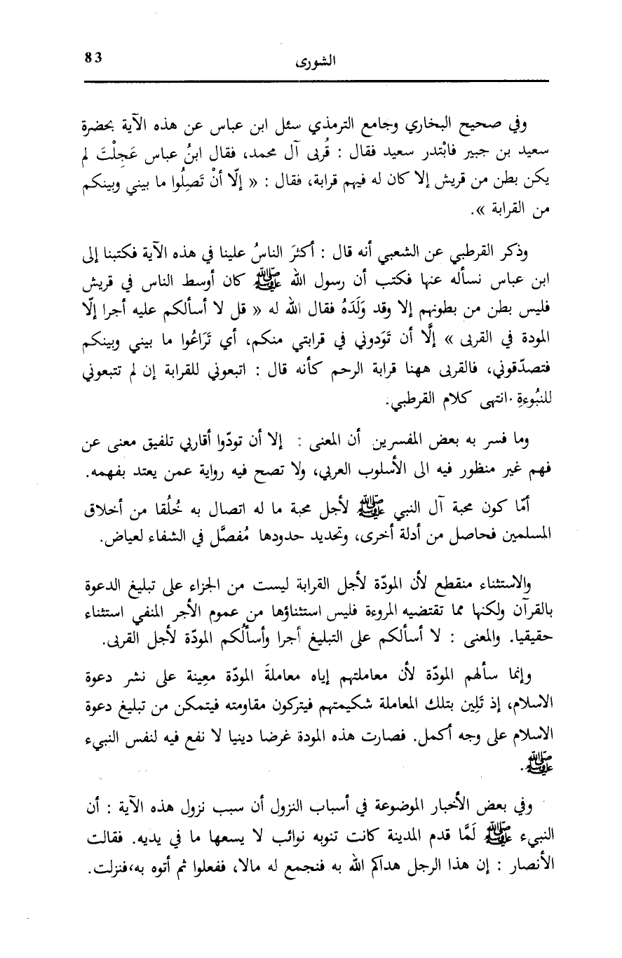 وَفِي «صَحِيح البُخَارِيّ» و «جَامع التِّرْمِذِيِّ» سُئِلَ ابْنُ عَبَّاسٍ عَنْ هَذِهِ الْآيَةِ بِحَضْرَةِ سَعِيدِ بْنِ جُبَيْرٍ فَابْتَدَرَ سَعِيدٌ فَقَالَ: قُرْبَى آلِ مُحَمَّدٍ، فَقَالَ ابْنُ عَبَّاسٍ: عَجِلْتَ لَمْ يَكُنْ بَطْنٌ مِنْ قُرَيْشٍ إِلَّا كَانَ لَهُ فِيهِمْ قَرَابَةٌ، فَقَالَ: إِلَّا أَنْ تَصِلُوا مَا بَيْنِي وَبَيْنَكُمْ مِنَ الْقَرَابَةِ. وَذَكَرَ الْقُرْطُبِيُّ عَنِ الشَّعْبِيِّ أَنَّهُ قَالَ: أَكْثَرَ النَّاسُ عَلَيْنَا فِي هَذِهِ الْآيَةِ فَكَتَبْنَا إِلَى ابْنِ عَبَّاسٍ نَسْأَلُهُ عَنْهَا فَكَتَبَ أَنَّ رَسُول الله صَلَّى اللهُ عَلَيْهِ وَسَلَّمَ كَانَ أَوْسَطَ النَّاسِ فِي قُرَيْشٍ فَلَيْسَ بَطْنٌ مِنْ بُطُونِهِمْ إِلَّا وَقَدْ وَلَدَهُ فَقَالَ اللَّهُ لَهُ: قُلْ لَا أَسْئَلُكُمْ عَلَيْهِ أَجْراً إِلَّا الْمَوَدَّةَ فِي الْقُرْبى إِلَّا أَنْ تَوَدُّونِي فِي قَرَابَتِي مِنْكُمْ، أَيْ تُرَاعُوا مَا بَيْنِي وَبَيْنَكُمْ فَتَصُدِّقُونِي، فَالْقُرْبَى هَاهُنَا قَرَابَةُ الرَّحِمِ كَأَنَّهُ قَالَ: