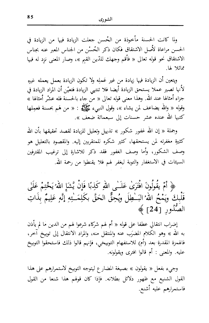 أَمْ يَقُولُونَ افْتَرى عَلَى اللَّهِ كَذِباً فَإِنْ يَشَإِ اللَّهُ يَخْتِمْ عَلى قَلْبِكَ وَيَمْحُ اللَّهُ الْباطِلَ وَيُحِقُّ الْحَقَّ بِكَلِماتِهِ إِنَّهُ عَلِيمٌ بِذاتِ الصُّدُورِ (24)