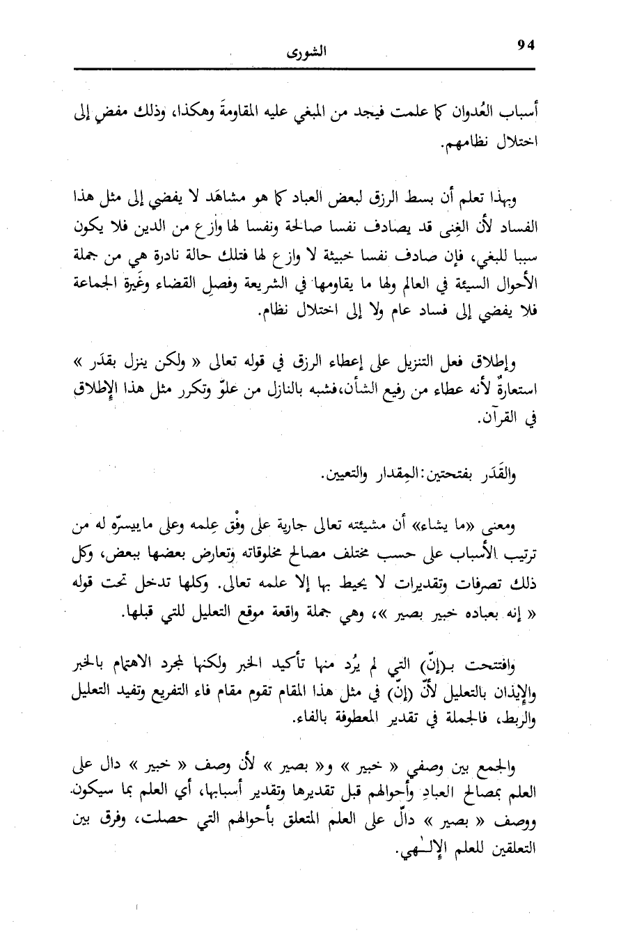 أَسْبَابِ الْعُدْوَانِ كَمَا عَلِمْتَ فَيَجِدُ مِنَ الْمَبْغِيِّ عَلَيْهِ الْمُقَاوَمَةَ وَهَكَذَا، وَذَلِكَ مُفْضٍ إِلَى اخْتِلَالِ نِظَامِهِمْ. وَبِهَذَا تَعْلَمُ أَنَّ بَسْطَ الرِّزْقِ لِبَعْضِ الْعِبَادِ كَمَا هُوَ مُشَاهَدٌ لَا يُفْضِي إِلَى مِثْلِ هَذَا الْفَسَادِ لِأَنَّ الْغِنَى قَدْ يُصَادِفُ نَفْسًا صَالِحَةً وَنَفْسًا لَهَا وَازِعٌ مِنَ الدِّينِ فَلَا يَكُونُ سَبَبًا لِلْبَغْيِ، فَإِنْ صَادَفَ نَفْسًا خَبِيثَةً لَا وَازِعَ لَهَا فَتِلْكَ حَالَةٌ نَادِرَةٌ هِيَ مِنْ جُمْلَةِ الْأَحْوَالِ السَّيِّئَةِ فِي الْعَالَمِ وَلَهَا مَا يُقَاوِمُهَا فِي الشَّرِيعَةِ وَفَصْلِ الْقَضَاءِ وَغَيْرَةِ الْجَمَاعَةِ فَلَا يُفْضِي إِلَى فَسَادٍ عَامٍّ وَلَا إِلَى اخْتِلَالِ نِظَامٍ.