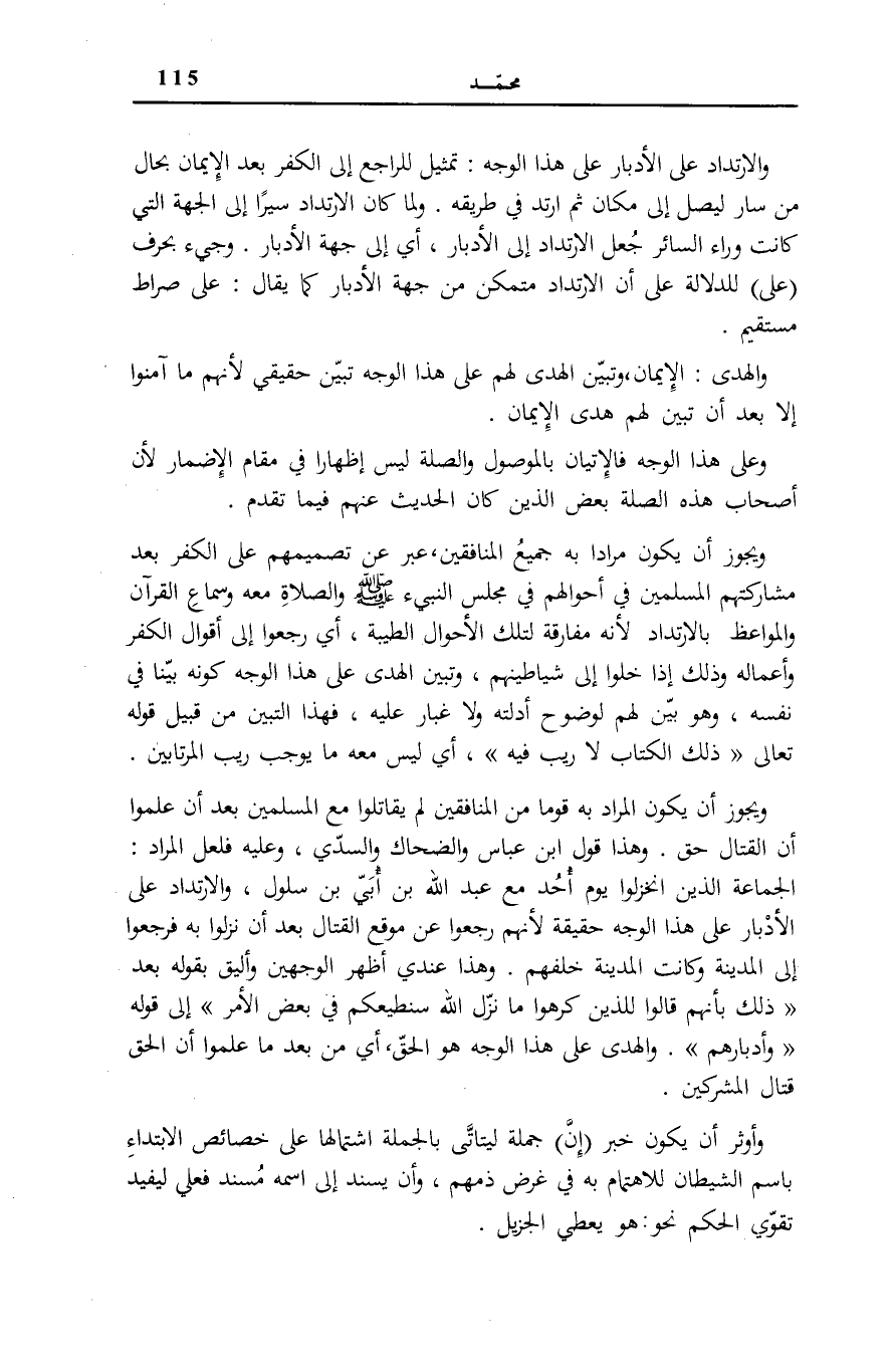 وَعَلَى هَذَا الْوَجْهِ فَالْإِتْيَانُ بِالْمَوْصُولِ وَالصِّلَةِ لَيْسَ إِظْهَارًا فِي مَقَامِ الْإِضْمَارِ لِأَنَّ أَصْحَابَ هَذِهِ الصِّلَةِ بَعْضُ الَّذِينَ كَانَ الْحَدِيثُ عَنْهُمْ فِيمَا تَقَدَّمَ. وَيَجُوزُ أَنْ يَكُونَ مُرَادًا بِهِ جَمِيعُ الْمُنَافِقِينَ، عُبِّرَ عَنْ تَصْمِيمِهِمْ عَلَى الْكُفْرِ بَعْدَ مُشَارَكَتِهِمُ الْمُسْلِمِينَ فِي أَحْوَالِهِمْ فِي مجْلِس النبيء صَلَّى اللهُ عَلَيْهِ وَسَلَّمَ وَالصَّلَاةِ مَعَهُ وَسَمَاعِ الْقُرْآنِ وَالْمَوَاعِظِ بِالِارْتِدَادِ لِأَنَّهُ مُفَارَقَةٌ لِتِلْكَ الْأَحْوَالِ الطَّيِّبَةِ، أَيْ رَجَعُوا إِلَى أَقْوَالِ الْكُفْرِ وَأَعْمَالِهِ وَذَلِكَ إِذَا خَلَوْا إِلَى شَيَاطِينِهِمْ، وَتَبَيُّنُ الْهُدَى عَلَى هَذَا الْوَجْهِ كَوْنُهُ بَيِّنًا فِي نَفْسِهِ، وَهُوَ بَيِّنٌ لَهُمْ لِوُضُوحِ أَدِلَّتِهِ وَلَا غُبَارَ عَلَيْهِ، فَهَذَا التَّبَيُّنُ مِنْ قَبِيلِ قَوْلِهِ تَعَالَى: ذلِكَ الْكِتابُ لَا رَيْبَ فِيهِ [الْبَقَرَة: 2] ، أَيْ لَيْسَ مَعَهُ مَا يُوجِبُ رَيْبَ الْمُرْتَابِينَ. وَيَجُوزُ أَنْ يَكُونَ الْمُرَادُ بِهِ قَوْمًا مِنَ الْمُنَافِقِينَ لَمْ يُقَاتِلُوا مَعَ الْمُسْلِمِينَ بَعْدَ أَنْ عَلِمُوا أَنَّ الْقِتَالَ حَقٌّ. وَهَذَا قَوْلُ ابْنِ عَبَّاسٍ وَالضَّحَّاكِ وَالسُّدِّيِّ، وَعَلَيْهِ فَلَعَلَّ الْمُرَادَ: