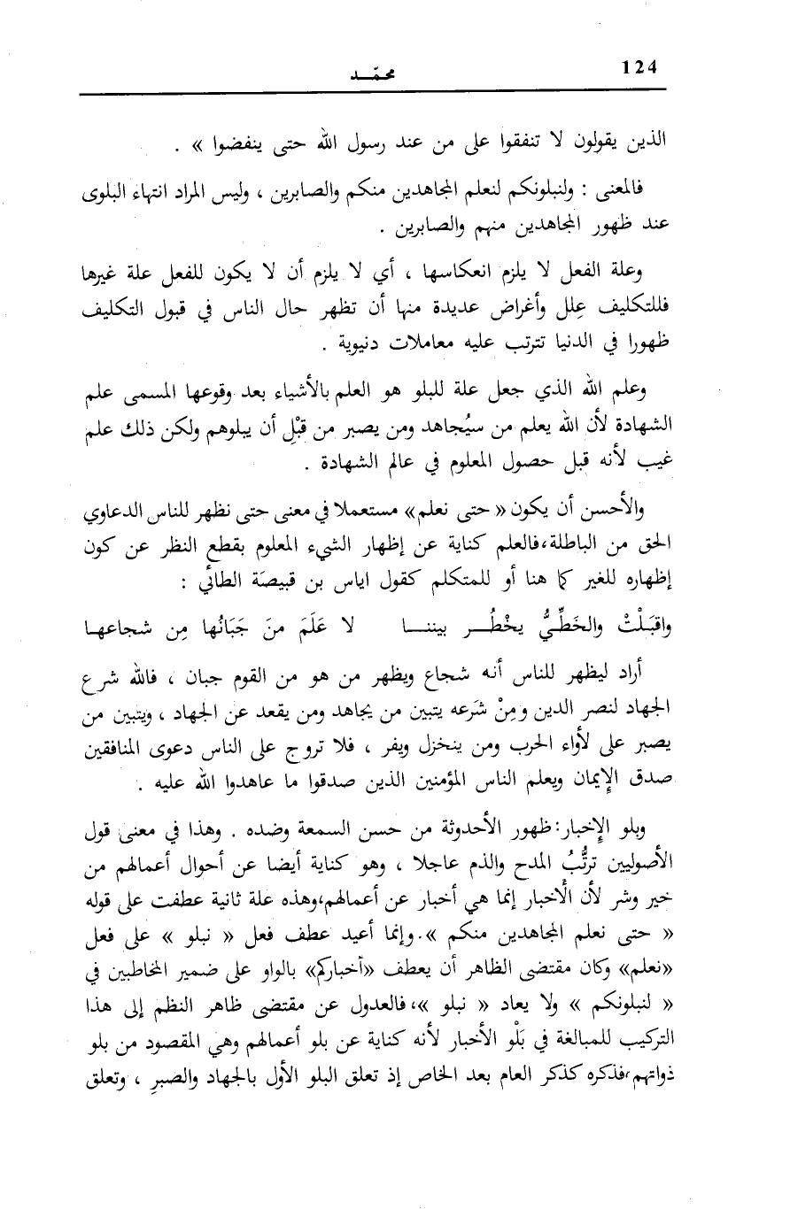 وَبَلْوُ الْإِخْبَارِ: ظُهُورُ الْأُحْدُوثَةِ مِنْ حُسْنِ السُّمْعَةِ وَضِدِّهِ. وَهَذَا فِي مَعْنَى قَوْلِ الْأُصُولِيِّينَ تَرَتَّبَ الْمَدْحُ وَالذَّمُّ عَاجِلًا، وَهُوَ كِنَايَةٌ أَيْضًا عَنْ أَحْوَالِ أَعْمَالِهِمْ مِنْ خَيْرٍ وَشَرٍّ لِأَنَّ الْأَخْبَارَ إِنَّمَا هِيَ أَخْبَارٌ عَنْ أَعْمَالِهِمْ، وَهَذِهِ عِلَّةٌ ثَانِيَةٌ عُطِفَتْ عَلَى قَوْلِهِ: حَتَّى نَعْلَمَ الْمُجاهِدِينَ مِنْكُمْ. وَإِنَّمَا أُعِيدَ عطف فعل نَبْلُوَا عَلَى فِعْلِ نَعْلَمَ وَكَانَ مُقْتَضَى الظَّاهِرِ أَنْ يُعْطَفَ أَخْبارَكُمْ بِالْوَاوِ عَلَى ضَمِيرِ الْمُخَاطَبِينَ فِي لَنَبْلُوَنَّكُمْ وَلَا يُعَاد نَبْلُوَا، فَالْعُدُولُ عَنْ مُقْتَضَى ظَاهِرِ النَّظْمِ إِلَى هَذَا التَّرْكِيبِ لِلْمُبَالَغَةِ فِي بلو لأخبار لِأَنَّهُ كِنَايَةٌ عَنْ بَلْوِ أَعْمَالِهِمْ وَهِيَ الْمَقْصُودُ مِنْ بَلْوِ ذَوَاتِهِمْ، فَذِكْرُهُ كَذِكْرِ الْعَامِّ بَعْدَ الْخَاصِّ إِذْ تَعَلَّقَ الْبَلْوُ الْأَوَّلُ بِالْجِهَادِ وَالصَّبْرِ، وَتَعَلَّقَ