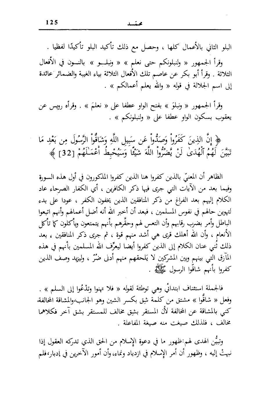 الْبَلْوُ الثَّانِي بِالْأَعْمَالِ كُلِّهَا، وَحَصَلَ مَعَ ذَلِكَ تَأْكِيدُ الْبَلْوِ تَأْكِيدًا لَفْظِيًّا. وَقَرَأَ الْجُمْهُورُ وَلَنَبْلُوَنَّكُمْ حَتَّى نَعْلَمَ وَنَبْلُوَا بِالنُّونِ فِي الْأَفْعَالِ الثَّلَاثَةِ. وَقَرَأَ أَبُو بَكْرٍ عَنْ عَاصِمٍ تِلْكَ الْأَفْعَالَ الثَّلَاثَةَ بِيَاءِ الْغَيْبَةِ وَالضَّمَائِرُ عَائِدَةٌ إِلَى اسْمِ الْجَلَالَةِ فِي قَوْلِهِ: وَاللَّهُ يَعْلَمُ أَعْمالَكُمْ. وَقَرَأَ الْجُمْهُور وَنَبْلُوَا بِفَتْحِ الْوَاوِ عَطْفًا عَلَى نَعْلَمَ. وَقَرَأَهُ رُوَيْسٌ عَنْ يَعْقُوبَ بِسُكُونِ الْوَاوِ عَطْفًا على وَلَنَبْلُوَنَّكُمْ.