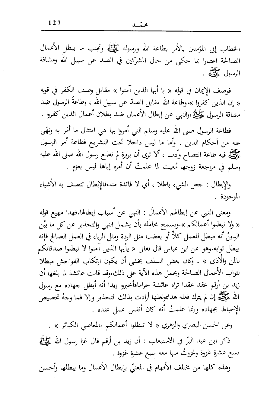 وَعَنِ الْحَسَنِ الْبَصْرِيِّ وَالزُّهْرِيِّ: لَا تُبْطِلُوا أَعْمَالَكُمْ بِالْمَعَاصِي الْكَبَائِرِ. ذَكَرَ ابْنُ عَبْدِ الْبَرِّ فِي «الِاسْتِيعَابِ» : «أَنَّ زَيْدَ بْنَ أَرْقَمَ قَالَ غَزَا رَسُول الله صَلَّى اللهُ عَلَيْهِ وَسَلَّمَ تِسْعَ عَشْرَةَ غَزْوَةً وَغَزَوْتُ مِنْهَا مَعَهُ سَبْعَ عَشْرَةَ غَزْوَةً. وَهَذِهِ كُلُّهَا مِنْ مُخْتَلِفِ الْأَفْهَامِ فِي الْمَعْنِيِّ بِإِبْطَالِ الْأَعْمَالِ وَمَا يُبْطِلُهَا وَأَحْسَنُ