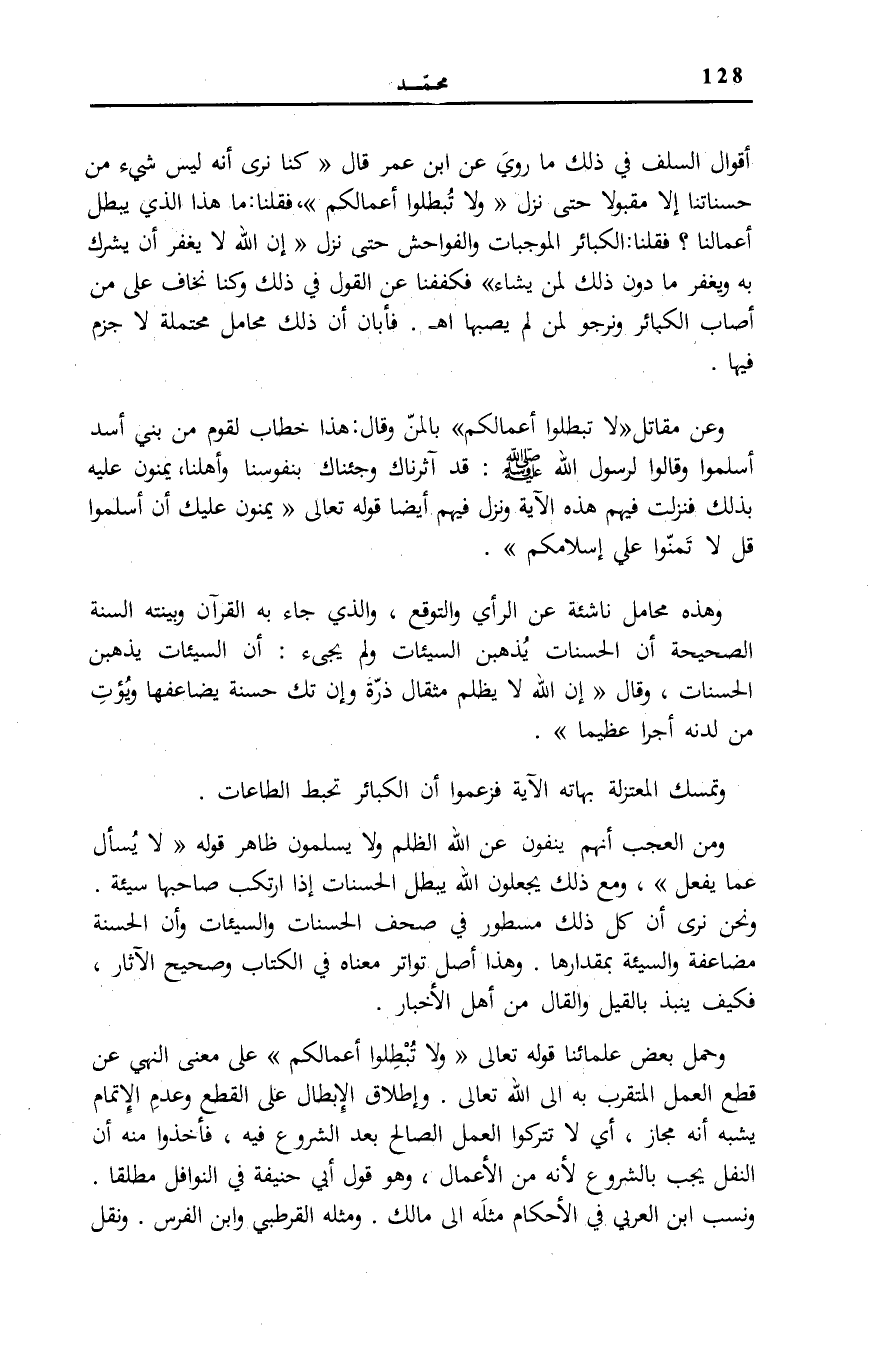 أَقْوَالِ السَّلَفِ فِي ذَلِكَ مَا رُوِيَ عَنِ ابْنِ عُمَرَ قَالَ: «كُنَّا نَرَى أَنَّهُ لَيْسَ شَيْءٌ مِنْ حَسَنَاتِنَا إِلَّا مَقْبُولًا حَتَّى نَزَلَ وَلا تُبْطِلُوا أَعْمالَكُمْ، فَقُلْنَا: مَا هَذَا الَّذِي يُبْطِلُ أَعْمَالَنَا؟ فَقُلْنَا: الْكَبَائِرُ الْمُوجِبَاتُ وَالْفَوَاحِشُ حَتَّى نَزَلَ إِنَّ اللَّهَ لَا يَغْفِرُ أَنْ يُشْرَكَ بِهِ وَيَغْفِرُ مَا دُونَ ذلِكَ لِمَنْ يَشاءُ [النِّسَاء: 48] فَكَفَفْنَا عَنِ الْقَوْلِ فِي ذَلِكَ وَكُنَّا نَخَافُ عَلَى مَنْ أَصَابَ الْكَبَائِرَ وَنَرْجُو لِمَنْ لم يصبهَا» اهـ. فَأَبَانَ أَنَّ ذَلِكَ مَحَامِلُ مُحْتَمَلَةٌ لَا جَزْمَ فِيهَا.