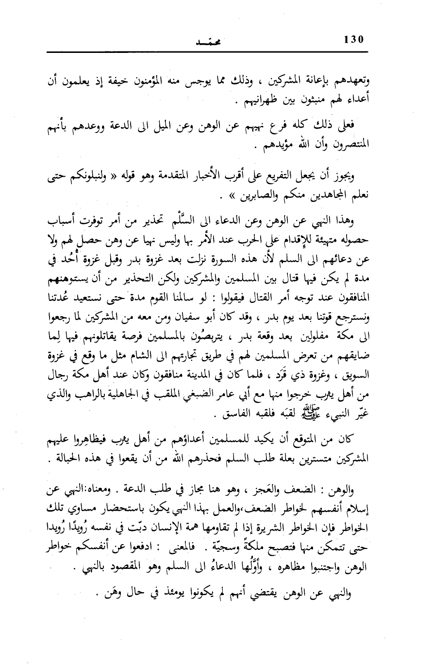وَهَذَا النَّهْيُ عَنِ الْوَهَنِ وَعَنِ الدُّعَاءِ إِلَى السَّلْمِ تَحْذِيرٌ مِنْ أَمْرٍ تَوَفَّرَتْ أَسْبَابُ حُصُولِهِ مُتَهَيِّئَةً لِلْإِقْدَامِ عَلَى الْحَرْبِ عِنْدَ الْأَمْرِ بِهَا وَلَيْسَ نَهْيًا عَنْ وَهَنٍ حَصَلَ لَهُمْ وَلَا عَنْ دُعَائِهِمْ إِلَى السَّلْمِ لِأَنَّ هَذِهِ السُّورَةَ نَزَلَتْ بَعْدَ غَزْوَةِ بَدْرٍ وَقَبْلَ غَزْوَةِ أُحُدٍ فِي مُدَّةٍ لَمْ يَكُنْ فِيهَا قِتَالٌ بَيْنَ الْمُسْلِمِينَ وَالْمُشْرِكِينَ وَلَكِنَّ التَّحْذِيرَ مِنْ أَنْ يَسْتَوْهِنَهُمُ الْمُنَافِقُونَ عِنْدَ تَوَجُّهِ أَمْرِ الْقِتَالِ فَيَقُولُوا: لَوْ سَالَمْنَا الْقَوْمَ مُدَّةً حَتَّى نَسْتَعِيدَ عُدَّتَنَا وَنَسْتَرْجِعَ قُوَّتَنَا بَعْدَ يَوْمِ بَدْرٍ، وَقَدْ كَانَ أَبُو سُفْيَانَ وَمَنْ مَعَهُ مِنَ الْمُشْرِكِينَ لَمَّا رَجَعُوا إِلَى مَكَّةَ مَفْلُولِينَ بَعْدَ وَقْعَةِ بَدْرٍ، يَتَرَبَّصُونَ بِالْمُسْلِمِينَ فُرْصَةً يُقَاتِلُونَهُمْ فِيهَا لِمَا ضَايَقَهُمْ مِنْ تَعَرُّضِ الْمُسْلِمِينَ لَهُمْ فِي طَرِيقِ تِجَارَتِهِمْ إِلَى الشَّامِ مِثْلَ مَا وَقَعَ فِي غَزْوَةِ السَّوِيقِ، وَغَزْوَةِ ذِي قَرَدٍ، فَلَمَّا كَانَ فِي الْمَدِينَةِ مُنَافِقُونَ وَكَانَ عِنْدَ أَهْلِ مَكَّةَ رِجَالٌ مِنْ أَهْلِ يَثْرِبَ خَرَجُوا مِنْهَا مَعَ أبي عَامر الضبغي الْمُلَقَّبِ فِي الْجَاهِلِيَّةِ بِالرَّاهِبِ وَالَّذِي غيّر النبيء صَلَّى اللهُ عَلَيْهِ وَسَلَّمَ لَقَبَهُ فَلَقَّبَهُ الْفَاسِقَ.