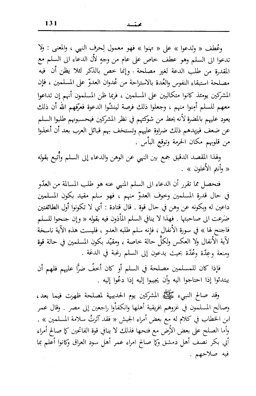 فَهَذَا لَا يُنَافِي السَّلْمَ الْمَأْذُونَ فِيهِ بِقَوْلِهِ: وَإِنْ جَنَحُوا لِلسَّلْمِ فَاجْنَحْ لَها فِي سُورَةِ الْأَنْفَالِ [61] ، فَإِنَّهُ سَلْمٌ طَلَبَهُ الْعَدُوُّ، فَلَيْسَتْ هَذِهِ الْآيَةُ نَاسِخَةً لِآيَةِ الْأَنْفَالِ وَلَا الْعَكْسَ وَلِكُلٍّ حَالَةٌ خَاصَّةٌ، وَمُقَيَّدٌ بِكَوْنِ الْمُسْلِمِينَ فِي حَالَةِ قُوَّةٍ وَمَنَعَةٍ وَعِدَّةٍ بِحَيْثُ يَدْعُونَ إِلَى السَّلْمِ رَغْبَةً فِي الدَّعَةِ. فَإِذَا كَانَ لِلْمُسْلِمِينَ مَصْلَحَةٌ فِي السَّلْمِ أَوْ كَانَ أَخَفَّ ضُرًّا عَلَيْهِمْ فَلَهُمْ أَنْ يَبْتَدِئُوا إِذَا احْتَاجُوا إِلَيْهِ وَأَنْ يُجِيبُوا إِلَيْهِ إِذَا دُعُوا إِلَيْهِ.