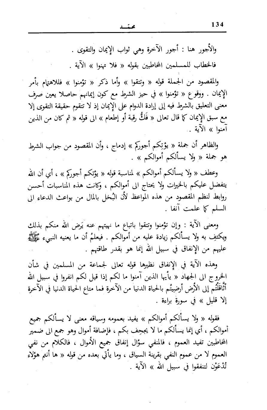 وَالظَّاهِرُ أَنَّ جُمْلَةَ يُؤْتِكُمْ أُجُورَكُمْ إِدْمَاجٌ، وَأَنَّ الْمَقْصُودَ مِنْ جَوَابِ الشَّرْطِ هُوَ جملَة وَلا يَسْئَلْكُمْ أَمْوالَكُمْ. وَعطف وَلا يَسْئَلْكُمْ أَمْوالَكُمْ لِمُنَاسَبَةِ قَوْلِهِ: يُؤْتِكُمْ أُجُورَكُمْ، أَيْ أَنَّ اللَّهَ يَتَفَضَّلُ عَلَيْكُمْ بِالْخَيْرَاتِ وَلَا يَحْتَاجُ إِلَى أَمْوَالِكُمْ، وَكَانَتْ هَذِهِ الْمُنَاسَبَاتُ أَحْسَنَ رَوَابِطَ لِنَظْمِ الْمَقْصُودِ مِنْ هَذِهِ الْمَوَاعِظِ لِأَنَّ الْبُخْلَ بِالْمَالِ مِنْ بَوَاعِثِ الدُّعَاءِ إِلَى السَّلْمِ كَمَا عَلِمْتَ آنِفًا.