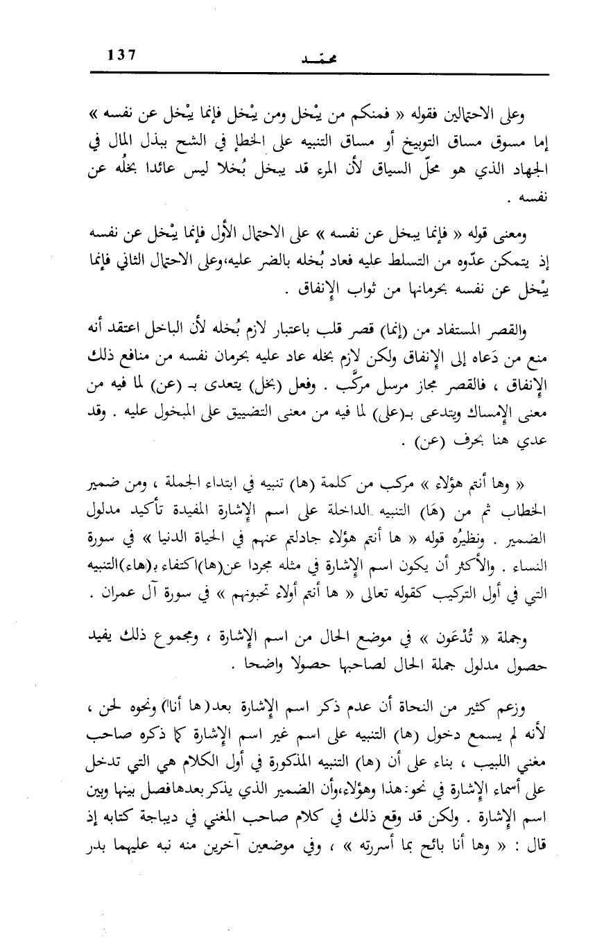 وَعَلَى الِاحْتِمَالَيْنِ فَقَوْلُهُ: فَمِنْكُمْ مَنْ يَبْخَلُ وَمَنْ يَبْخَلْ فَإِنَّما يَبْخَلُ عَنْ نَفْسِهِ إِمَّا مَسُوقٌ مَسَاقَ التَّوْبِيخِ أَوْ مَسَاقَ التَّنْبِيهِ عَلَى الْخَطَأِ فِي الشُّحِّ بِبَذْلِ الْمَالِ فِي الْجِهَادِ الَّذِي هُوَ مَحَلُّ السِّيَاقِ لِأَنَّ الْمَرْءَ قَدْ يَبْخَلُ بُخْلًا لَيْسَ عَائِدًا بُخْلُهُ عَنْ نَفْسِهِ.