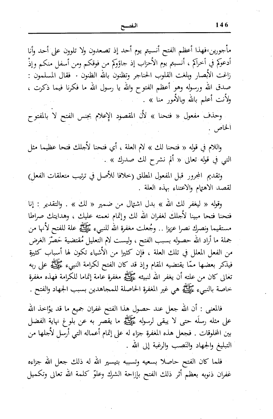 وَقَوْلُهُ: لِيَغْفِرَ لَكَ اللَّهُ بَدَلُ اشْتِمَالٍ مِنْ ضَمِيرِ لَكَ. وَالتَّقْدِيرُ: إِنَّا فَتَحْنَا فَتْحًا مُبِينًا لِأَجْلِكَ لِغُفْرَانِ اللَّهِ لَكَ وَإِتْمَامِ نِعْمَتِهِ عَلَيْكَ، وَهِدَايَتِكَ صِرَاطًا مُسْتَقِيمًا وَنَصْرِكَ نَصْرًا عَزِيزًا ... وَجُعِلَتْ مَغْفِرَةُ الله للنبيء صَلَّى اللهُ عَلَيْهِ وَسَلَّمَ عِلَّةً لِلْفَتْحِ لِأَنَّهَا مِنْ جُمْلَةِ مَا أَرَادَ اللَّهُ حُصُولَهُ بِسَبَبِ الْفَتْحِ، وَلَيْسَتْ لَامُ التَّعْلِيلِ مُقْتَضِيَةً حَصْرَ الْغَرَضِ مِنَ الْفِعْلِ الْمُعَلَّلِ فِي تِلْكَ الْعِلَّةِ، فَإِنَّ كَثِيرًا مِنَ الْأَشْيَاءِ تَكُونُ لَهَا أَسْبَابٌ كَثِيرَةٌ فَيُذْكَرُ بَعْضُهَا مِمَّا يَقْتَضِيهِ الْمَقَامُ وَإِذْ قَدْ كَانَ الْفَتْحُ لكرامة النبيء صَلَّى اللهُ عَلَيْهِ وَسَلَّمَ عَلَى رَبِّهِ تَعَالَى كَانَ مِنْ عِلَّتِهِ أَنْ يغْفر الله لنبيئه صَلَّى اللهُ عَلَيْهِ وَسَلَّمَ مَغْفِرَةً عَامَّةً إِتْمَامًا لِلْكَرَامَةِ فَهَذِهِ مَغْفِرَةٌ خَاصَّة بالنبيء صَلَّى اللهُ عَلَيْهِ وَسَلَّمَ هِيَ غَيْرُ الْمَغْفِرَةِ الْحَاصِلَةِ لِلْمُجَاهِدِينَ بِسَبَبِ الْجِهَادِ وَالْفَتْحِ.