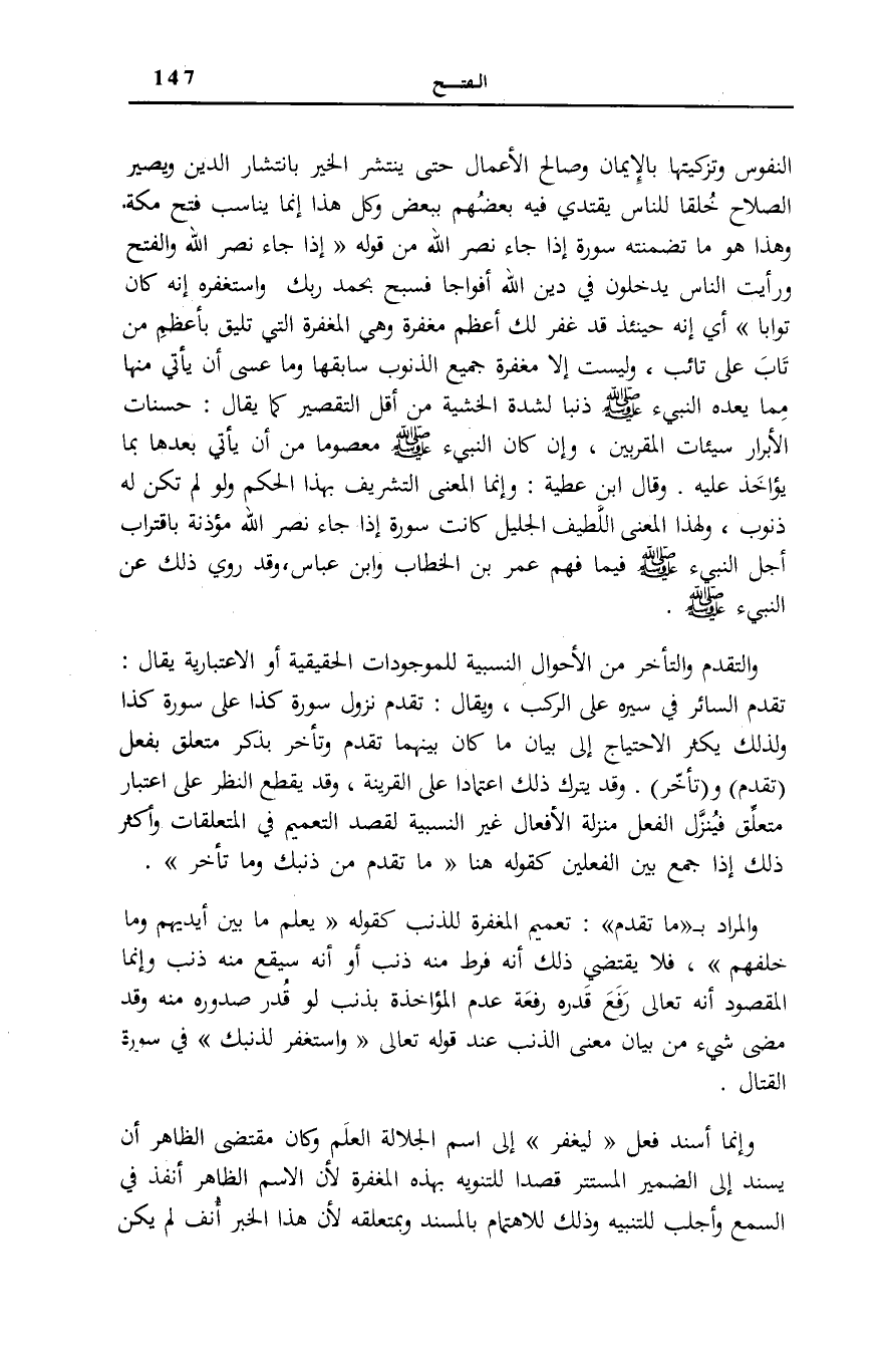 سُورَةُ إِذا جاءَ نَصْرُ اللَّهِ مِنْ قَوْلِهِ: إِذا جاءَ نَصْرُ اللَّهِ وَالْفَتْحُ وَرَأَيْتَ النَّاسَ يَدْخُلُونَ فِي دِينِ اللَّهِ أَفْواجاً فَسَبِّحْ بِحَمْدِ رَبِّكَ وَاسْتَغْفِرْهُ إِنَّهُ كانَ تَوَّاباً [النَّصْر: 1- 3] أَيْ إِنَّهُ حِينَئِذٍ قَدْ غُفِرَ لَكَ أَعْظَمَ مَغْفِرَةٍ وَهِيَ الْمَغْفِرَةُ الَّتِي تَلِيقُ بِأَعْظَمِ مَنْ تَابَ عَلَى تَائِبٍ، وَلَيْسَتْ إِلَّا مَغْفِرَةَ جَمِيعِ الذُّنُوبِ سَابِقِهَا وَمَا عَسَى أَنْ يَأْتِيَ مِنْهَا مِمَّا يعده النبيء صَلَّى اللهُ عَلَيْهِ وَسَلَّمَ ذَنْبًا لِشِدَّةِ الْخَشْيَةِ مِنْ أَقَلِّ التَّقْصِيرِ كَمَا يُقَالُ: حَسَنَاتُ الْأَبْرَارِ سَيِّئَاتُ الْمُقَرَّبِينَ، وَإِنْ كَانَ النبيء صَلَّى اللهُ عَلَيْهِ وَسَلَّمَ مَعْصُومًا مِنْ أَنْ يَأْتِيَ بَعْدَهَا بِمَا يُؤَاخَذُ عَلَيْهِ. وَقَالَ ابْنُ عَطِيَّةَ: وَإِنَّمَا الْمَعْنَى التَّشْرِيفُ بِهَذَا الْحُكْمِ وَلَوْ لَمْ تَكُنْ لَهُ ذُنُوبٌ، وَلِهَذَا الْمَعْنَى اللَّطِيفِ الْجَلِيلِ كَانَتْ سُورَةُ إِذا جاءَ نَصْرُ اللَّهِ مُؤْذِنَةً بِاقْتِرَابِ أجل النبيء صَلَّى اللهُ عَلَيْهِ وَسَلَّمَ فِيمَا فَهِمَ عُمَرُ بْنُ الْخَطَّابِ وَابْنُ عَبَّاسٍ، وَقَدْ رُوِيَ ذَلِكَ عَن النبيء صَلَّى اللهُ عَلَيْهِ وَسَلَّمَ.